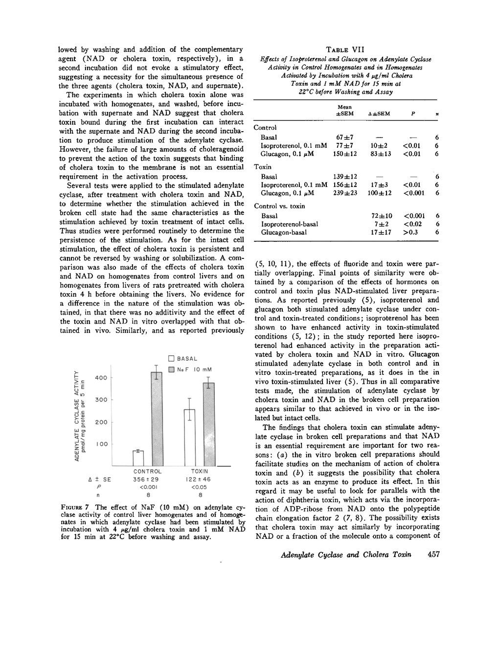 The effect of cholera toxin on adenylate cyclase from rat liver has been studied in a broken cell preparation. The activation of the enzyme in this in vitro preparation requires the addition of nicotinamide adenine dinucleotide (NAD) to the incubation medium and the presence of cell components other than the membrane-bound adenylate cyclase. Once the activation of the cyclase is produced, the effect persists despite repeated washing or solubilization of the enzyme. The effect can be obtained with concentrations of cholera toxin as low as 0.4 nM after 15 min of incubation at 22 degrees C, and stimulation can be detected after only 5 min of incubation at 37 degrees C. The activation of the enzyme is still apparent after at least 2 h at 0 degrees C. Preincubation with choleragenoid in vitro does not interfere with this effect of the toxin. Animals pretreated by an intravenous injection of cholera toxin do not respond to the in vitro addition of cholera toxin and NAD to the same extent as untreated animals; i.e., the effects overlap to suggest that the in vitro effect is the same as that in vivo. Responses to isoproterenol, glucagon, and NaF were also similar in the in vitro broken cell-activated system, as previously reported for the enzyme activated in vivo.