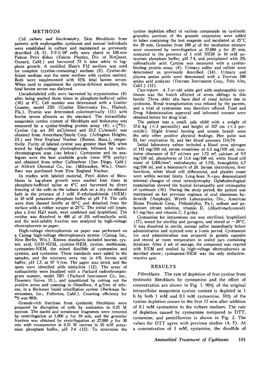 Certain aminothiols rapidly deplete cultured cystinotic skin fibroblasts of their abnormally high free (nonprotein) cystine pool. The free cystine content of these cells if reduced by over 90% in 1 h with 0.1 mM cysteamine. This is more rapid than previously known methods of removing free cystine from cystinotic fibroblasts. The disulfide, cystamine, is also able to deplete cystinotic cells of free cystine. A patient with nephropathic cystinosis and end-stage renal disease was treated with cysteamine, both intravenously and orally. Both methods of administration rapidly lowered the free cystine content of the patient's peripheral leukocytes. Study of the patient's urinary sulfur excretion did not conclusively determine the effect of this therapy on the total body cystine pool. Her renal status remained at end stage after 1 mo of oral cysteamine, when an episode of grand mal seizures prompted cessation of the study. Determination of the proper place of aminothiol therapy in this disease will depend upon further clinical trial with patients whose kidney function has not deteriorated to the point of irreversible change, accompanied by careful monitoring of plasma aminothiol levels.