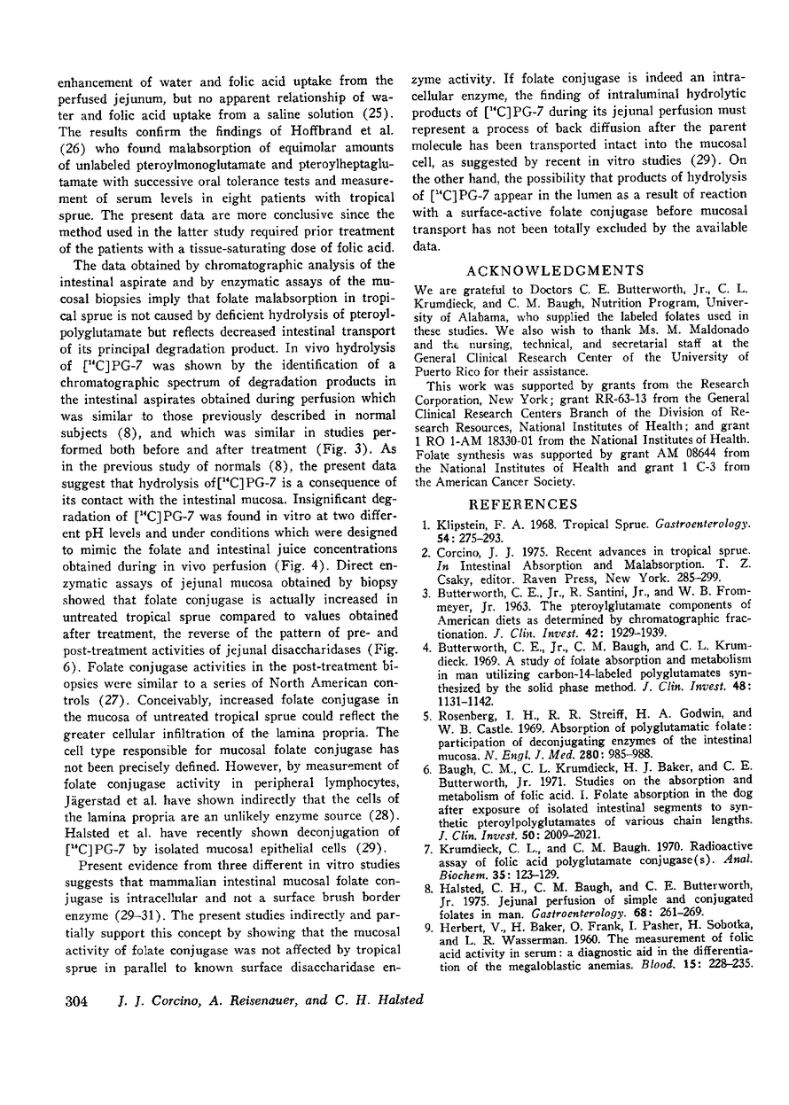 Absorption of labeled simple 3′,5′,9′-3H pteroylmonoglutamate, ([3H]PG-1) and conjugated pteroyl-μ[14C]glutamyl-γ-hexaglutamate, ([14C]PG-7) folates was assessed in six patients with tropical sprue, before and after 6 mo of treatment, utilizing jejunal perfusion and urinary recovery techniques. Degradation products of [14C]PG-7 which were produced during perfusion were identified by DEAE-cellulose column chromatography. Jejunal mucosal activities of folate conjugase, lactase, sucrase, and maltase were measured in every patient. Malabsorption of both [3H]PG-1 and [14C]PG-7 was found in every untreated patient, with significant improvement after therapy. The urinary excretion of 3H and 14C paralleled the luminal disappearance of both isotopes. The chromatographic patterns of intraluminal degradation products of [14C]PG-7 obtained during perfusion did not differ from those previously found in normal subjects and were similar in studies performed before and after treatment. The activity of folate conjugase was increased in the mucosa of the untreated patients when compared to the post-treatment levels while the activities of mucosal lactase, sucrase, and maltase were originally low and increased significantly after therapy. These observations suggest that folate conjugase originates at a different mucosal locus than the brush border disaccharidases, and are consistent with previous evidence that folate conjugase is an intracellular enzyme. The present studies have demonstrated unequivocal malabsorption of both simple and conjugated folates in tropical sprue. In tropical sprue, folate malabsorption is the reflection of impaired folate transport and not of impaired hydrolysis.