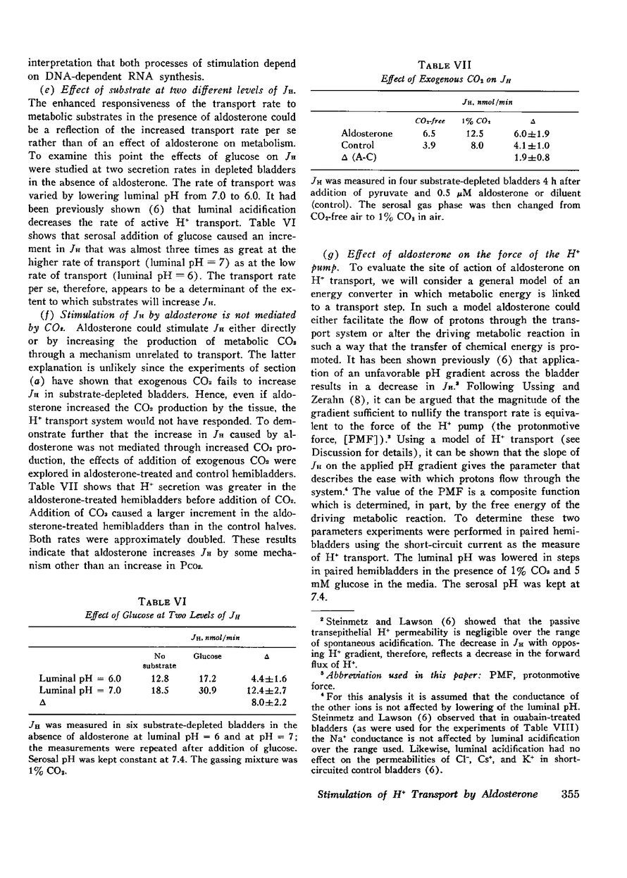 Aldosterone stimulates not only Na+ absorption but also urinary acidification. In this investigation the effects of aldosterone on H+ transport are examined in vitro in turtle bladder, a urinary membrane in which several of the factors controlling H+ transport have been defined. H+ transport was increased in bladder halves exposed to aldosterone compared to control halves. Stimulation of H+ secretion was observed as early as 1 h after addition of aldosterone and occurred before that of Na+ transport. In bladders depleted of endogenous substrate addition of glucose increased H+ transport more in aldosterone-treated halves (10.0+/-1.3 nmol/min) than in control halves (6.8+/-2.3). Addition of pyruvate failed to increase H+ transport (--0.3+/-0.7) in control halves but caused significant increments (2.4+/-0.5) in aldosterone-treated halves. In aldosterone-treated bladders glucose caused larger increments (16.5+/-2.7) in H+ transport than pyruvate (9.3+/-2.0) when halves of the same bladders were compared. Na+ transport, however, was equally increased by the two substrates. Despite the differences in time course and substrate requirements between the stimulation of H+ and Na+ transport, both increases were abolished by actinomycin-D. To examine the effect of aldosterone on the force of the H+ pump, protonmotive force, the pH gradient that would nullify the transport rate was determined with and without aldosterone. Aldosterone did not alter protonmotive force but significantly increased the slope of the H+ transport rate on the applied pH gradient. It is concluded that aldosterone stimulates H+ transport independently of Na+ transport. It increases the responsiveness of the transport rate to glucose and to a lesser extent pyruvate, an effect probably secondary to the increased transport rate. Equivalent circuit analysis indicates that aldosterone facilitates the flow of protons through the active transport pathway but does not increase the force of the pump.