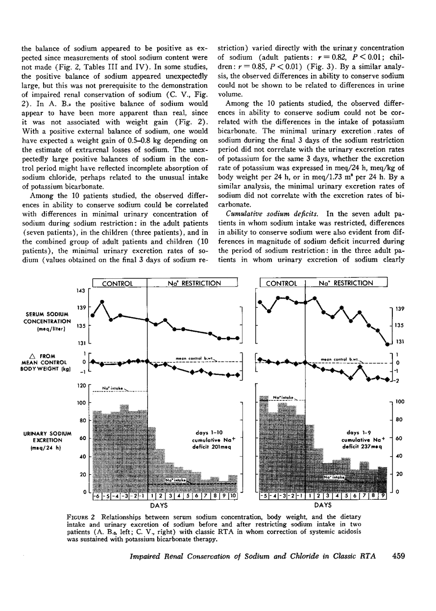 In 10 patients with classic renal tubular acidosis in whom correction of acidosis was sustained with orally administered potassium bicarbonate, renal conservation of sodium was evaluated when dietary intake of sodium was restricted to 9--13 meq/day. In five patients, renal conservation of sodium was impaired by at least one criterion of impairment. In the remaining patients, renal conservation of sodium appeared to be relatively well-maintained, but an impairment could not be excluded. In each of six patients studied during induced water diuresis, including two in whom renal conservation of sodium was not unequivocally impaired, the minimal urinary concentrations of sodium were inappropriately high and the urinary excretion rates of sodium were flow-dependent. These results provide direct evidence that an abnormality in renal transport of sodium can occur in classic renal tubular acidosis, and compel a reconsideration of the pathophysiology of disordered renal transport of sodium in this disorder. The results indicate that in at least some patients with classic renal tubular acidosis impaired renal conservation of sodium is not exclusively a reversible consequence of the renal acidification defect. These findings raise the question whether renal transport of sodium is unimpaired in any patients with classic renal tubular acidosis. In the presently studied patients, the impairment in renal conservation of sodium appeared to be in part the consequence of an impaired ability of the vasopressin-responsive segments of the distal nephron to generate and maintain appropriately steep transepithelial sodium concentration gradients.