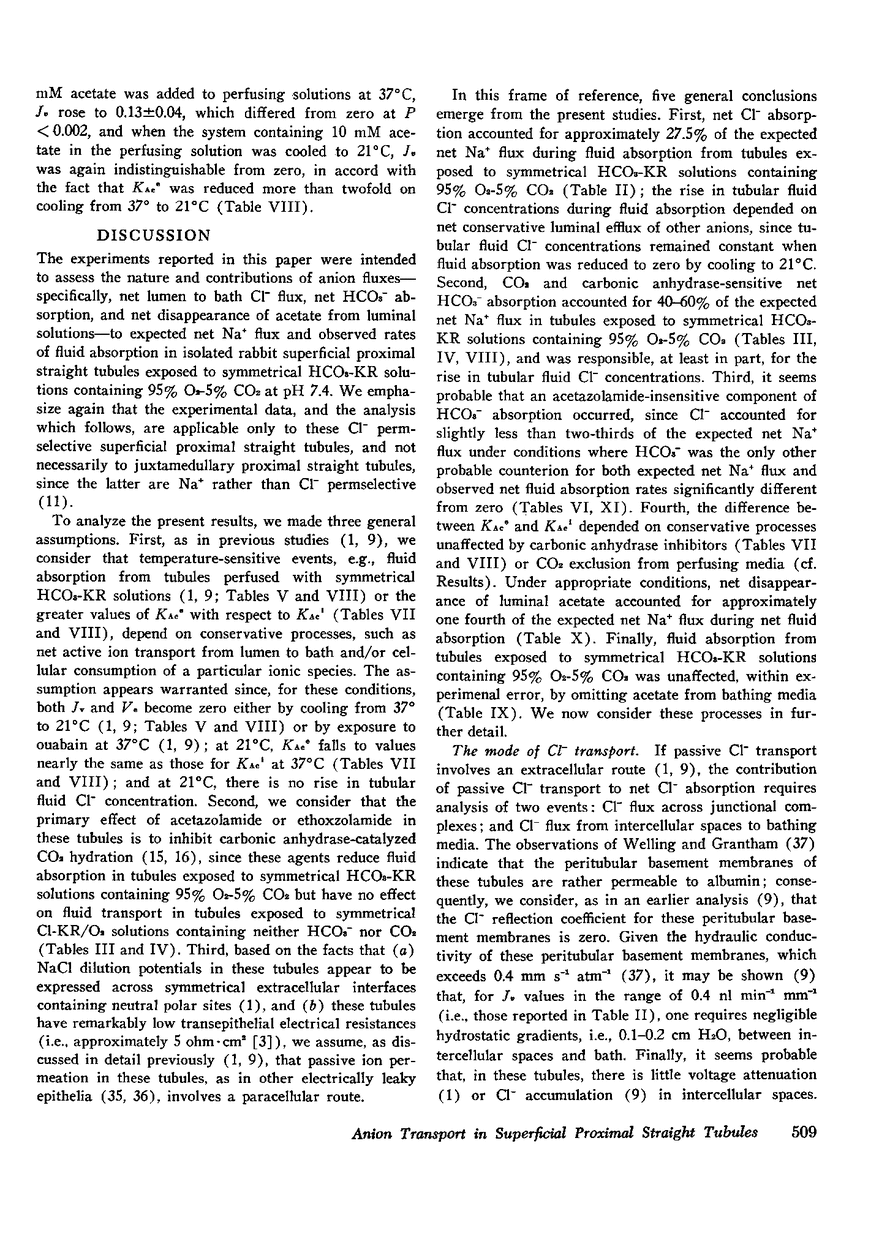 The experiments reported in this paper were designed to evaluate some of the characteristics of anion transport processes during fluid absorption from superficial proximal straight tubules isolated from rabbit kidney. We measured net chemical C1- flux during fluid absorption from tubules perfused and bathed with Krebs-Ringer buffers containing 113.6 mM C1-, 10 mM acetate, and 25 mM HCO-/3 at pH 7.4; assessed the effects of carbonic anhydrase inhibitors on net fluid absorption in the presence and absence of CO2; and evaluated the influx and efflux coefficients for [14C]-acetate transport at 37degreesC, at 21degreesC, and in the presence of carbonic anhydrase inhibitors. The experimental data shown that, for this nephron segment, net C1- flux accompanies approximately 27.5% of net Na+ absorption; and net C1- absorption may be accounted for by a passive transport process, primarily diffusional in nature. Fluid absorption in this nephron segment is reduced 40-60% by carbonic anhydrase inhibitors, but only when the tubules are exposed to 95% O2-5% CO2 rather than 100% O2. Thus, it seems probably that approximately half of Na+ absorption in these tubules may be rationalized in terms of a carbonic anhydrase-dependent CO2 hydration process. In addition, there may occur in these isolated proximal tubules an acetazolamide-insensitive moiety of HCO-/3 absorption comparable to that observed for proximal tubules in vivo. Finally, we provide evidence that net efflux of luminal acetate is due to metabolic energy-dependent processes other than CO2 hydration and may, under appropriate conditions, account for approximately one-fourth of net Na+ absorption.