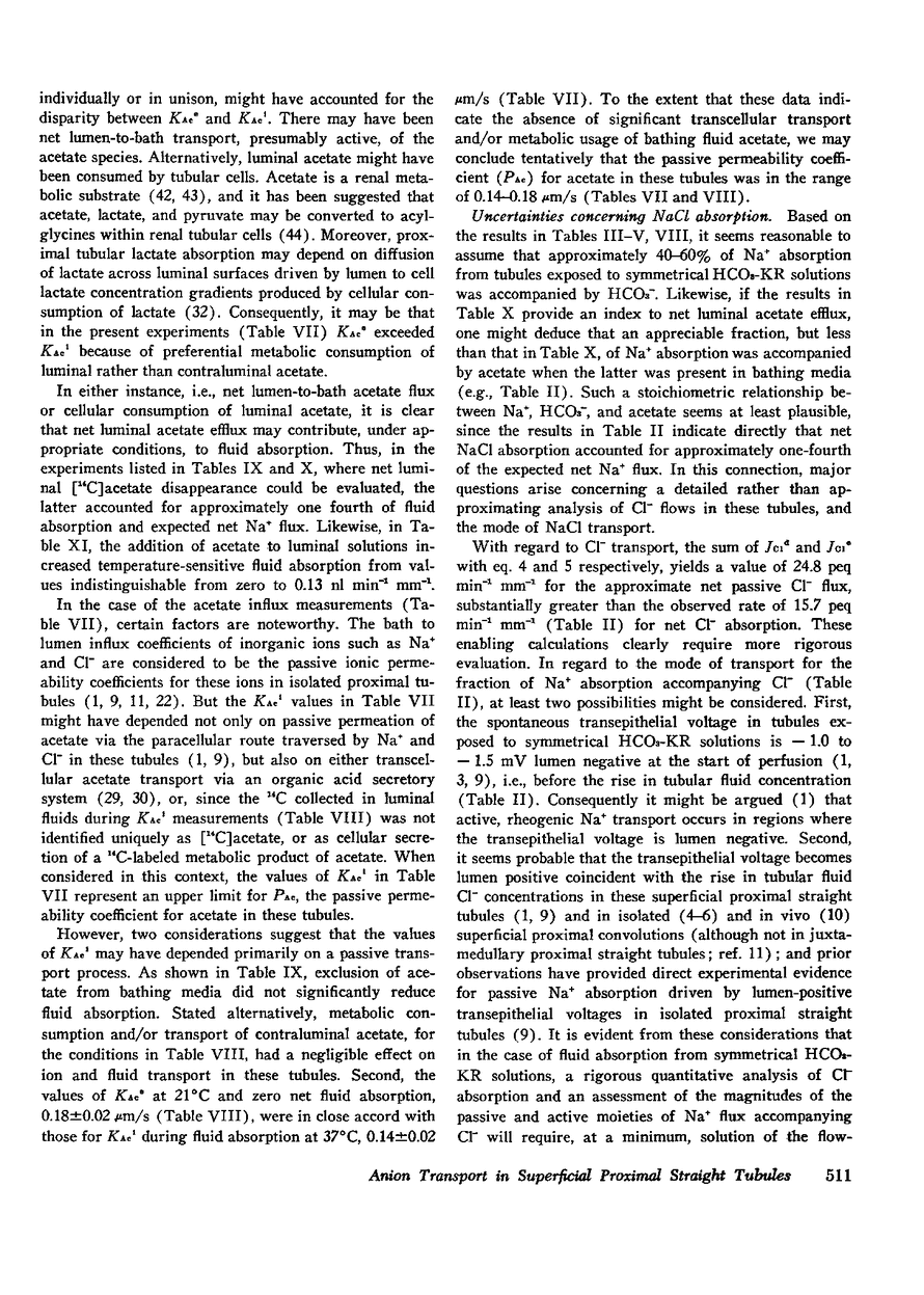 The experiments reported in this paper were designed to evaluate some of the characteristics of anion transport processes during fluid absorption from superficial proximal straight tubules isolated from rabbit kidney. We measured net chemical C1- flux during fluid absorption from tubules perfused and bathed with Krebs-Ringer buffers containing 113.6 mM C1-, 10 mM acetate, and 25 mM HCO-/3 at pH 7.4; assessed the effects of carbonic anhydrase inhibitors on net fluid absorption in the presence and absence of CO2; and evaluated the influx and efflux coefficients for [14C]-acetate transport at 37degreesC, at 21degreesC, and in the presence of carbonic anhydrase inhibitors. The experimental data shown that, for this nephron segment, net C1- flux accompanies approximately 27.5% of net Na+ absorption; and net C1- absorption may be accounted for by a passive transport process, primarily diffusional in nature. Fluid absorption in this nephron segment is reduced 40-60% by carbonic anhydrase inhibitors, but only when the tubules are exposed to 95% O2-5% CO2 rather than 100% O2. Thus, it seems probably that approximately half of Na+ absorption in these tubules may be rationalized in terms of a carbonic anhydrase-dependent CO2 hydration process. In addition, there may occur in these isolated proximal tubules an acetazolamide-insensitive moiety of HCO-/3 absorption comparable to that observed for proximal tubules in vivo. Finally, we provide evidence that net efflux of luminal acetate is due to metabolic energy-dependent processes other than CO2 hydration and may, under appropriate conditions, account for approximately one-fourth of net Na+ absorption.