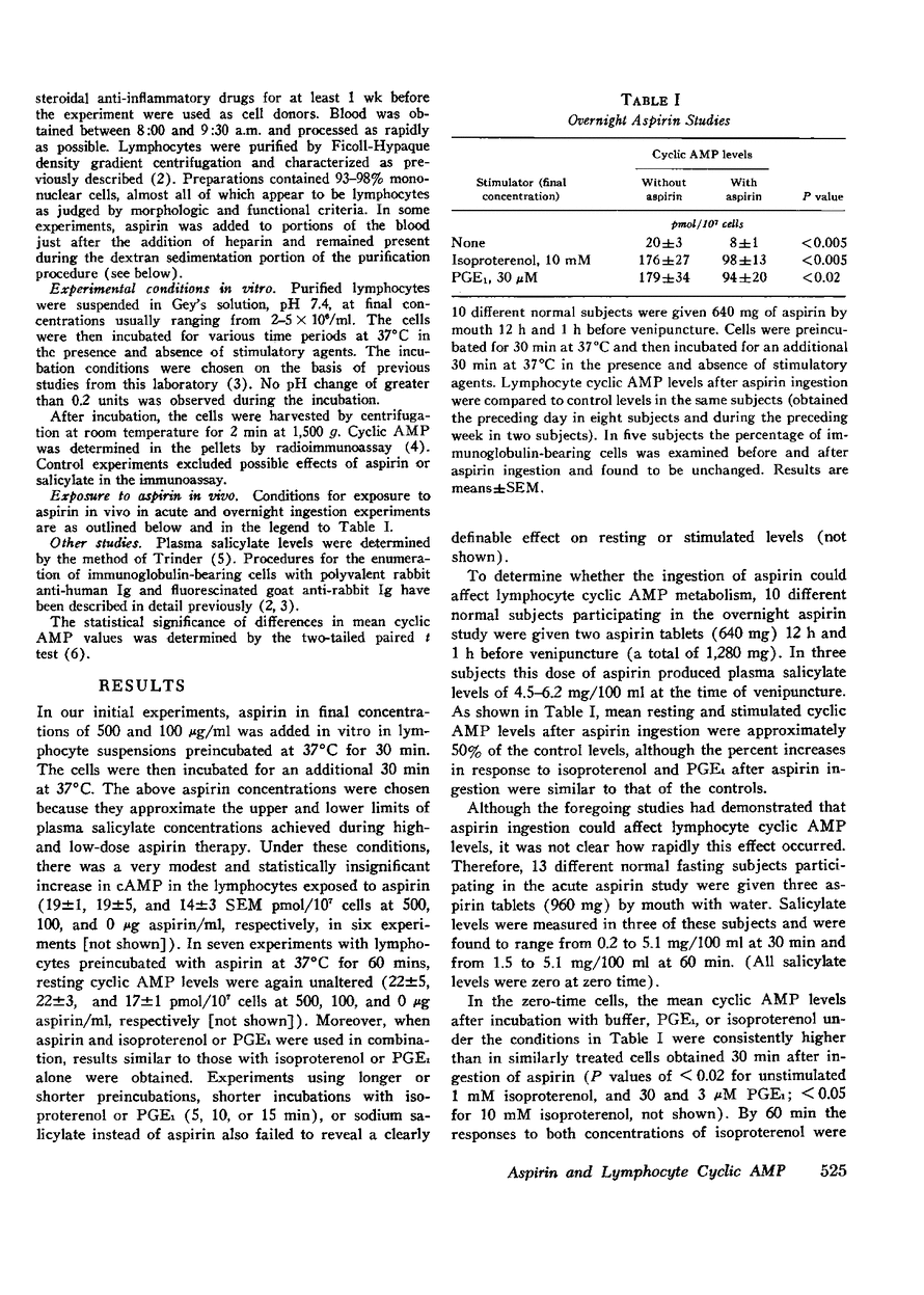 In purified lymphocytes from the peripheral blood of healthy human subjects who had ingested therapeutic doses of aspirin, there was a significant decrease in resting cyclic AMP levels as well as a partial inhibition of the rise in cyclic AMP with isoproterenol or prostaglandin E1. These changes were seen as early as 30 min after aspirin ingestion and did not appear to result from aspirin effects on lymphocyte recovery, purity, viability, or relative number of thymus- or bone marrow-derived lymphocytes. In contrast, the direct addition of aspirin to suspensions of purified peripheral lymphocytes did not significantly alter their cyclic AMP levels. However, an effect of aspirin could be obtained in vitro if aspirin was added to unprocessed whole blood during the dextran sedimentation phase of the cell purification. Thus the effect of aspirin on lymphocyte cyclic AMP metabolism, may be indirect, through other cells present in the peripheral blood.