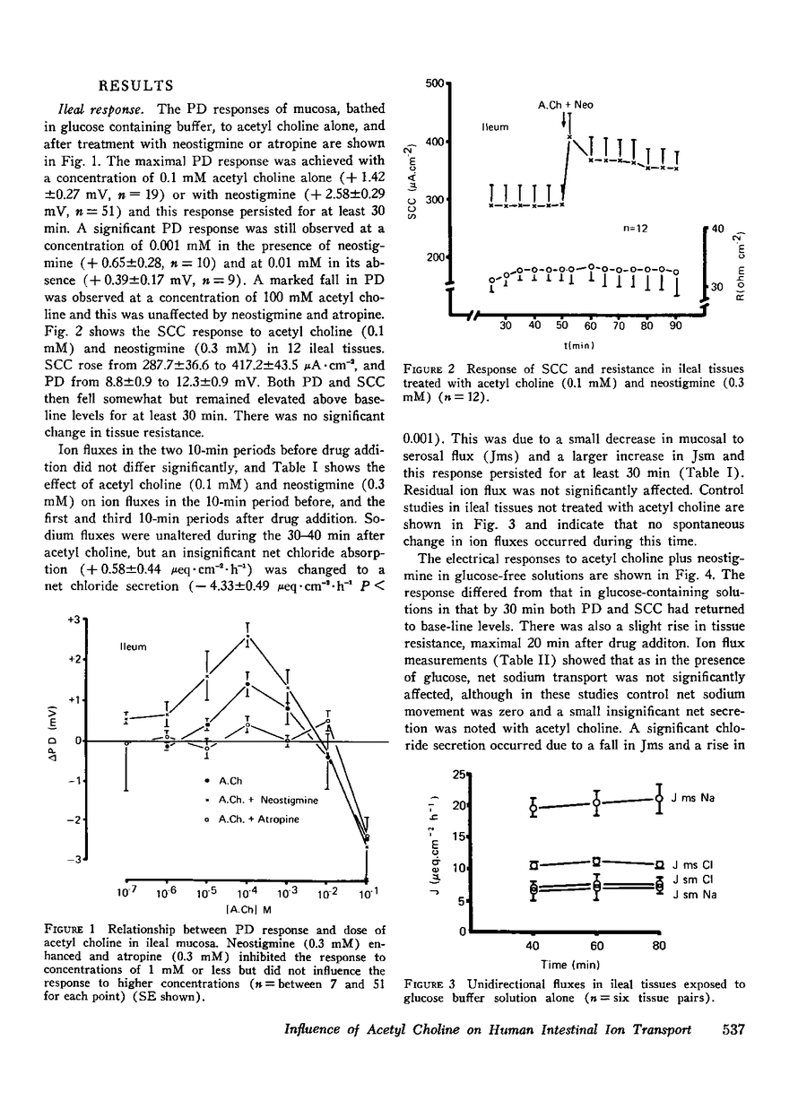 The possibility that the autonomic nervous system may influence the function of intestinal mucosa was investigated by assessing the effect of acetyl choline on ion transport in human intestine. Isolated pieces of stripped ileal mucosa were mounted in Perspex flux-chambers and bathed in isotonic glucose Ringer's solution. Acetyl choline caused a rise in mean potential difference (8.8-12.3 mV, P less than 0.002) and short circuit current (287.7-417.2 muA-cm-2, P less than 0.01) (n = 12), observable at a concentration of 0.01 mM and maximal at 0.1 mM. This effect was enhanced by neostigmine and blocked by atropine. Isotopic flux determinations revealed a change from a small mean net Cl absorption (58) to a net Cl secretion (-4.3mueq-cm-2-h-1P less than 0.001) due predominantly to an increase in the serosal to mucosal unidirectional flux of Cl (10.63-14.35 mueq-cm-2-h-1P less than 0.05) and a smaller reduction in the mucosal to serosal flux (11.22 to 10.02 mueq-cm-2-h-1P less than 0.05). Unidirectional and net Na transport was unaffected. A similar electrical and ion transport response was observed in a single study of two pieces of jejunal mucosa. In the absence of glucose net chloride secretion was produced and again an insignificant effect on net sodium transport was noted. Acetyl choline did not provoke a sustained effect on mucosal cyclic adenine nucleotide levels although a short-lived cyclic adenine nucleotide response was seen in some tissues 20-30 s after drug addition. These studies demonstrate that acetyl choline does influence human intestinal ion transport by stimulating chloride secretion and suggest a possible mechanism by which the parasympathetic nervous system could be concerned in the control of ion transport.