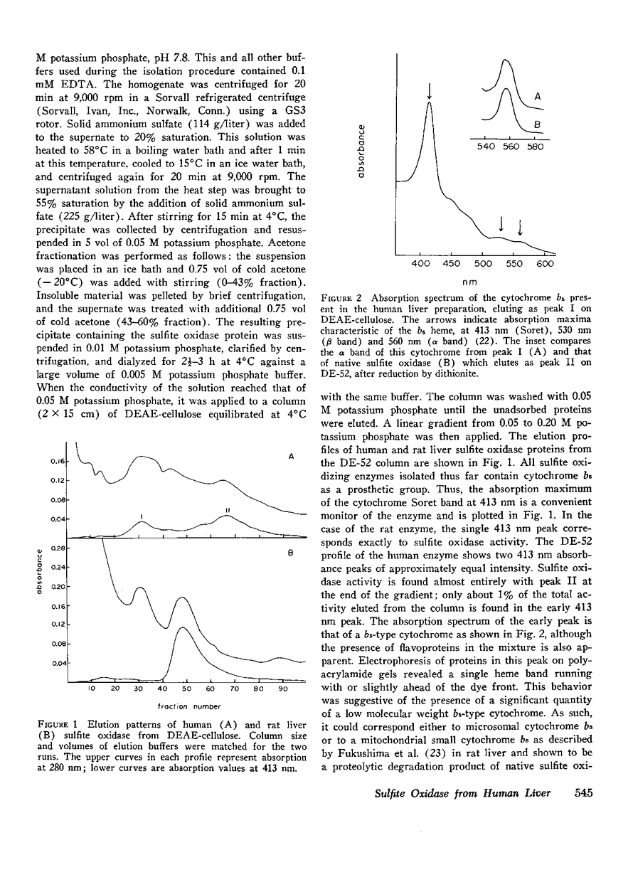 Sulfite oxidase has been purified to near homogeneity from human liver. Properties of the molecule have been investigated and compared to those of the rat liver enzyme which has been isolated in a pure form. Both proteins exist as dimeric molecules with one molybdenum and one cytochrome b5-type heme per sub-unit. The human enzyme has a slightly larger subunit molecular weight (61,100 vs. 57,200 daltons) and is a more negatively charged molecule. Decreased reactivity of the human enzyme with various electron acceptors suggests the presence of nonfunctional molybdenum centers in a portion of the molecules isolated. Human liver sulfite oxidase cross-reacts strongly with antibody prepared against the rat liver enzyme. Human enzyme activity is precipitated by antibody at concentrations about twofold greater than required for comparable complexation of rat sulfite oxidase.