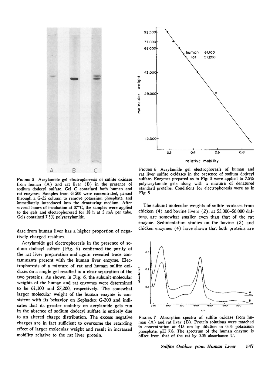 Sulfite oxidase has been purified to near homogeneity from human liver. Properties of the molecule have been investigated and compared to those of the rat liver enzyme which has been isolated in a pure form. Both proteins exist as dimeric molecules with one molybdenum and one cytochrome b5-type heme per sub-unit. The human enzyme has a slightly larger subunit molecular weight (61,100 vs. 57,200 daltons) and is a more negatively charged molecule. Decreased reactivity of the human enzyme with various electron acceptors suggests the presence of nonfunctional molybdenum centers in a portion of the molecules isolated. Human liver sulfite oxidase cross-reacts strongly with antibody prepared against the rat liver enzyme. Human enzyme activity is precipitated by antibody at concentrations about twofold greater than required for comparable complexation of rat sulfite oxidase.