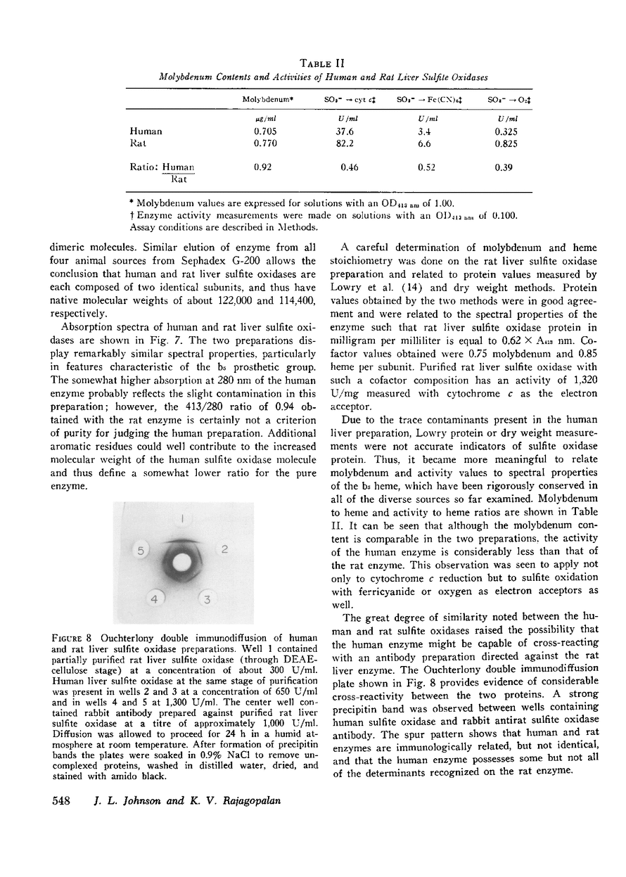 Sulfite oxidase has been purified to near homogeneity from human liver. Properties of the molecule have been investigated and compared to those of the rat liver enzyme which has been isolated in a pure form. Both proteins exist as dimeric molecules with one molybdenum and one cytochrome b5-type heme per sub-unit. The human enzyme has a slightly larger subunit molecular weight (61,100 vs. 57,200 daltons) and is a more negatively charged molecule. Decreased reactivity of the human enzyme with various electron acceptors suggests the presence of nonfunctional molybdenum centers in a portion of the molecules isolated. Human liver sulfite oxidase cross-reacts strongly with antibody prepared against the rat liver enzyme. Human enzyme activity is precipitated by antibody at concentrations about twofold greater than required for comparable complexation of rat sulfite oxidase.