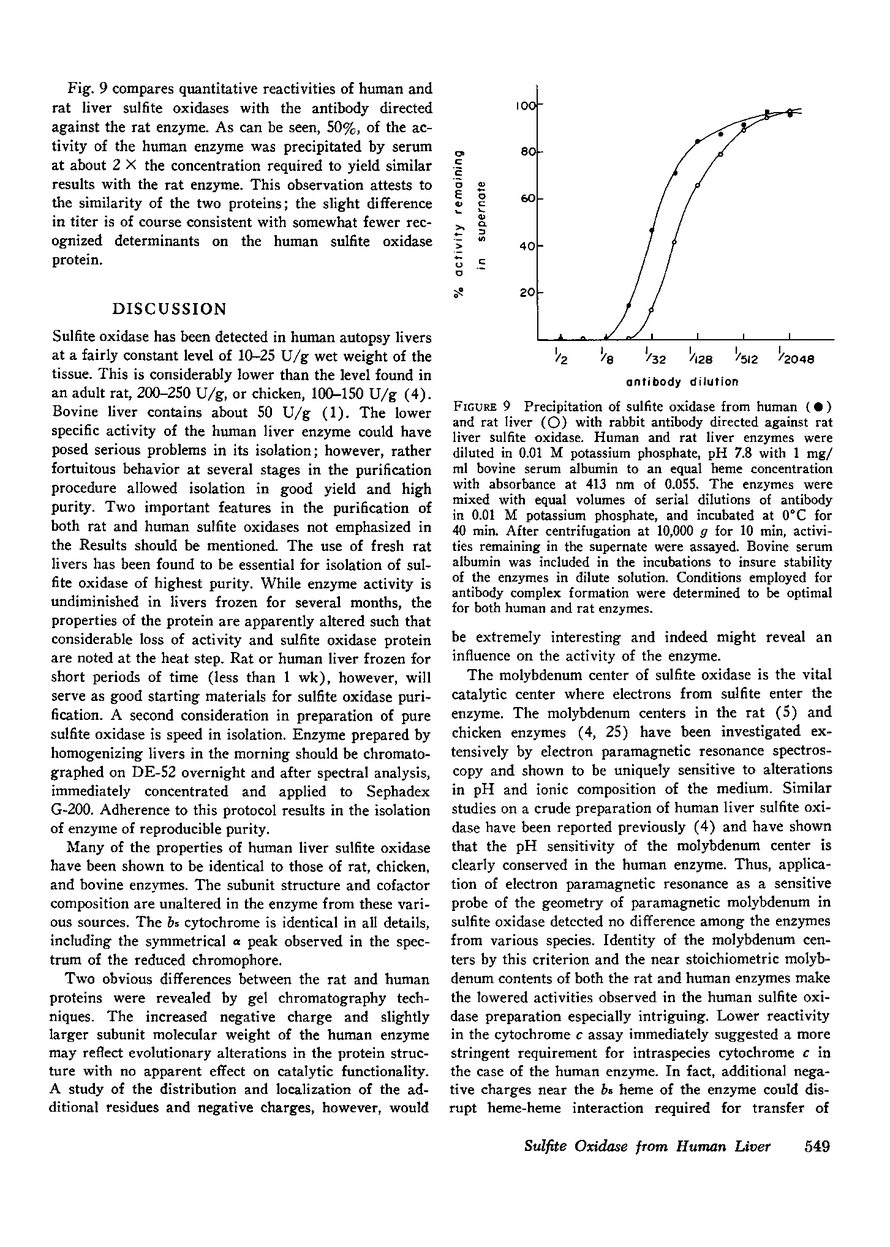 Sulfite oxidase has been purified to near homogeneity from human liver. Properties of the molecule have been investigated and compared to those of the rat liver enzyme which has been isolated in a pure form. Both proteins exist as dimeric molecules with one molybdenum and one cytochrome b5-type heme per sub-unit. The human enzyme has a slightly larger subunit molecular weight (61,100 vs. 57,200 daltons) and is a more negatively charged molecule. Decreased reactivity of the human enzyme with various electron acceptors suggests the presence of nonfunctional molybdenum centers in a portion of the molecules isolated. Human liver sulfite oxidase cross-reacts strongly with antibody prepared against the rat liver enzyme. Human enzyme activity is precipitated by antibody at concentrations about twofold greater than required for comparable complexation of rat sulfite oxidase.