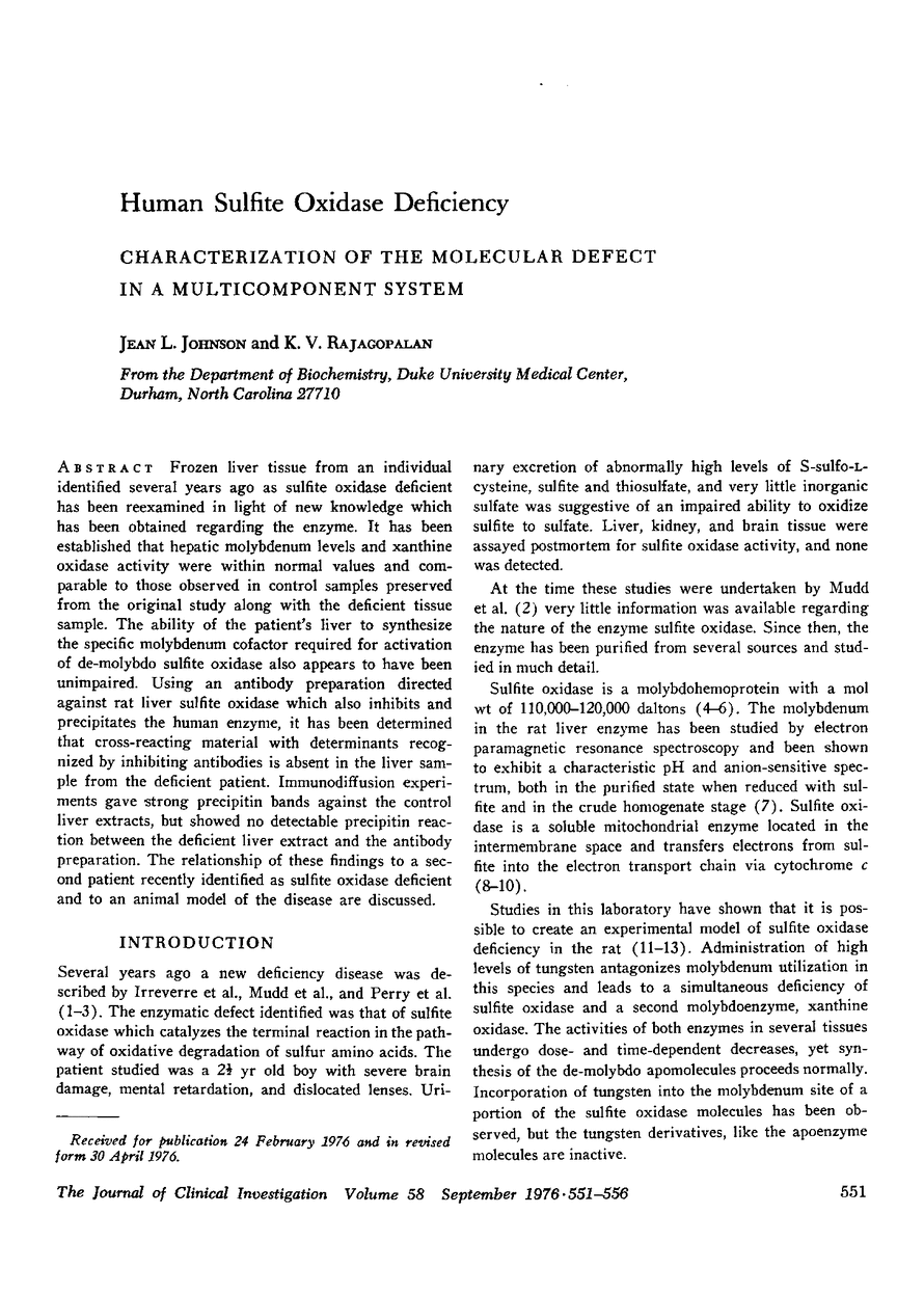 Frozen liver tissue from an individual identified several years ago as sulfite oxidase deficient has been reexamined in light of new knowledge which has been obtained regarding the enzyme. It has been established that hepatic molybdenum levels and xanthine oxidase activity were within normal values and comparable to those observed in control samples preserved from the original study along with the deficient tissue sample. The ability of the patient's liver to synthesize the specific molybdenum cofactor required for activation of de-molybdo sulfite oxidase also appears to have been unimpaired. Using an antibody preparation directed against rat liver sulfite oxidase which also inhibits and precipitates the human enzyme, it has been determined that cross-reacting material with determinants recognized by inhibiting antibodies is absent in the liver sample from the deficient patient. Immunodiffusion experiments gave strong precipitin bands against the control liver extracts, but showed no detectable precipitin reaction between the deficient liver extract and the antibody preparation. The relationship of these findings to a second patient recently identified as sulfite oxidase deficient and to an animal model of the disease are discussed.