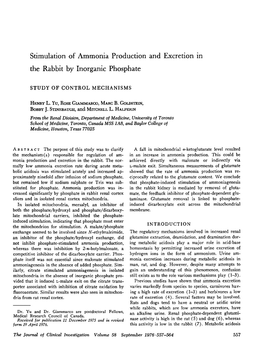 The purpose of this study was to clarify the mechanism (s) responsible for regulation of ammonia production and excretion in the rabbit. The normally low ammonia excretion rate during acute metabolic acidosis was stimulated acutely and increased approximately ninefold after infusion of sodium phosphate, but remained low if sodium sulphate or Tris was substituted for phosphate. Ammonia production was increased significantly by phosphate in rabbit renal cortex slices and in isolated renal cortex mitochondria. In isolated mitochondria, mersalyl, an inhibitor of both the phosphate/hydroxyl and phosphate/dicarboxylate mitochondrial carriers, inhibited the phosphate-induced stimulation, indicating that phosphate must enter the mitochondrion for stimulation. A malate/phosphate exchange seemed to be involved since N-ethylmaleimide, an inhibitor of the phosphate/hydroxyl exchange, did not inhibit phosphate-stimulated ammonia production, whereas there was inhibition by 2-n-butylmalonate, a competitive inhibitor of the dicarboxylate carrier. Phosphate itself was not essential since malonate stimulated ammoniagenesis in the absence of added phosphate. Similarly, citrate stimulated ammoniagenesis in isolated mitochondria in the absence of inorganic phosphate provided that it induced L-malate exit on the citrate transporter associated with inhibition of citrate oxidation by fluoroacetate. Similar results were also seen in mitochondria from rat renal cortex. A fall in mitochondrial alpha-ketoglutarate level resulted in an increase in ammonia production. This could be achieved directly with malonate or indirectly via L-malate exit. Simultaneous measurements of glutamate showed that the rate of ammonia production was reciprocally related to the glutamate content. We conclude that phosphate-induced stimulation of ammoniagenesis in the rabbit kidney is mediated by removal of glutamate, the feedback inhibitor of phosphate-dependent glutaminase. Glutamate removal is linked to phosphate-induced dicarboxylate exit across the mitochondrial membrane.