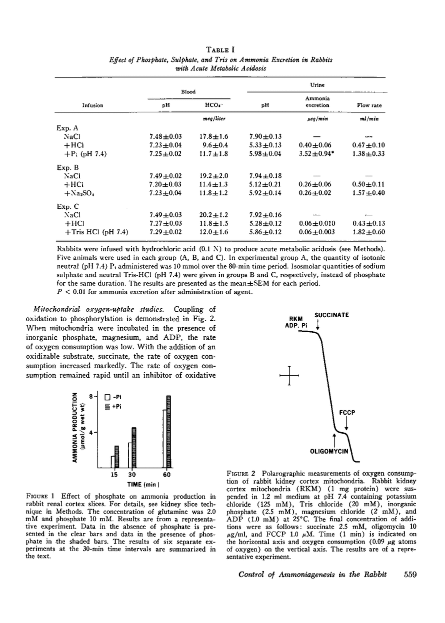 The purpose of this study was to clarify the mechanism (s) responsible for regulation of ammonia production and excretion in the rabbit. The normally low ammonia excretion rate during acute metabolic acidosis was stimulated acutely and increased approximately ninefold after infusion of sodium phosphate, but remained low if sodium sulphate or Tris was substituted for phosphate. Ammonia production was increased significantly by phosphate in rabbit renal cortex slices and in isolated renal cortex mitochondria. In isolated mitochondria, mersalyl, an inhibitor of both the phosphate/hydroxyl and phosphate/dicarboxylate mitochondrial carriers, inhibited the phosphate-induced stimulation, indicating that phosphate must enter the mitochondrion for stimulation. A malate/phosphate exchange seemed to be involved since N-ethylmaleimide, an inhibitor of the phosphate/hydroxyl exchange, did not inhibit phosphate-stimulated ammonia production, whereas there was inhibition by 2-n-butylmalonate, a competitive inhibitor of the dicarboxylate carrier. Phosphate itself was not essential since malonate stimulated ammoniagenesis in the absence of added phosphate. Similarly, citrate stimulated ammoniagenesis in isolated mitochondria in the absence of inorganic phosphate provided that it induced L-malate exit on the citrate transporter associated with inhibition of citrate oxidation by fluoroacetate. Similar results were also seen in mitochondria from rat renal cortex. A fall in mitochondrial alpha-ketoglutarate level resulted in an increase in ammonia production. This could be achieved directly with malonate or indirectly via L-malate exit. Simultaneous measurements of glutamate showed that the rate of ammonia production was reciprocally related to the glutamate content. We conclude that phosphate-induced stimulation of ammoniagenesis in the rabbit kidney is mediated by removal of glutamate, the feedback inhibitor of phosphate-dependent glutaminase. Glutamate removal is linked to phosphate-induced dicarboxylate exit across the mitochondrial membrane.
