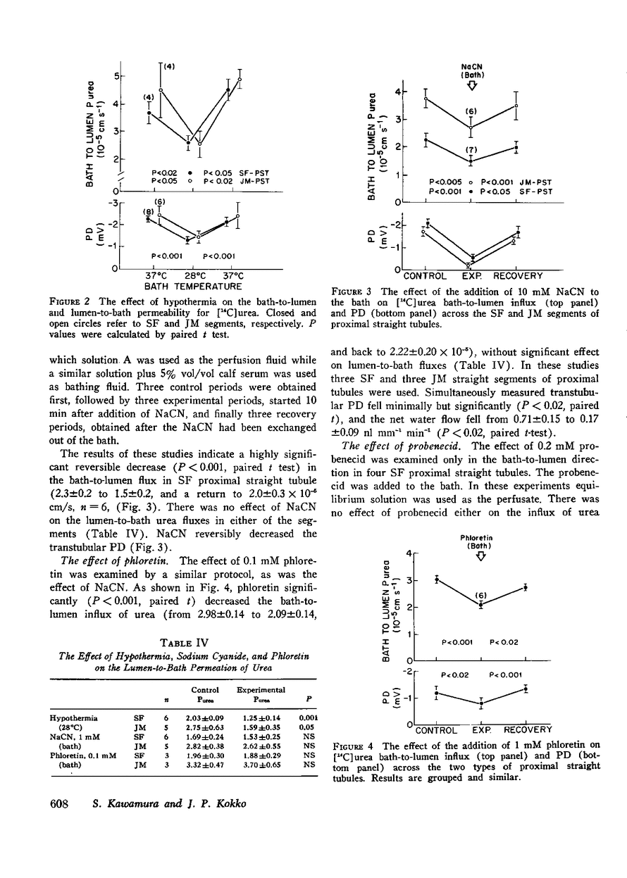 Studies utilizing in vitro microperfusion were designed to examine whether urea is actively or passively transported across superficial and juxtamedullary straight segments of rabbit proximal tubules. With perfusate and bath solutions containing 1 mM urea and electrolytes similar to normal plasma, the efflux (lumen-to-bath) isotopic permeability (X 10(-5) cm s-1) of superficial segments was 1.37 +/- 0.16 and of juxtamedullary segments was 2.14 +/- 0.20. In the same tubules, the influx (bath-to-lumen) isotopic permeability was 3.70 +/- 0.35 in superficial segments and 4.75 +/- 0.37 in juxtamedullary segments. Despite net water movement in the opposite direction (0.5 nl mm-1 min-1), the influx rate was significantly higher than the efflux rate of urea in both groups. With a low perfusion rate (2 nl/min) and equivalent specific activities of [14C]urea in bath and perfusate, the collected-to-perfused ratio of [14C]urea, corrected for volume marker change, was 1.07 +/- 0.01 in superficial and 1.09 +/- 0.01 in juxtamedullary nephrons, thus indicating net secretion in both segments. In separate studies urea influx was inhibited by hypothermia (decrease from 37 degrees to 28 degrees C), by phloretin (0.1 mM in bath), by cyanide (1 mM), but not by probenecid (0.2 mM). In each case the inhibition was highly significant and reversible. These data suggest that urea is actively secreted by the straight segments of both the superficial and juxtamedullary proximal tubules. These segments may, therefore, contribute significantly to the high urea concentration found at the bend of Henle's loop by micropuncture.