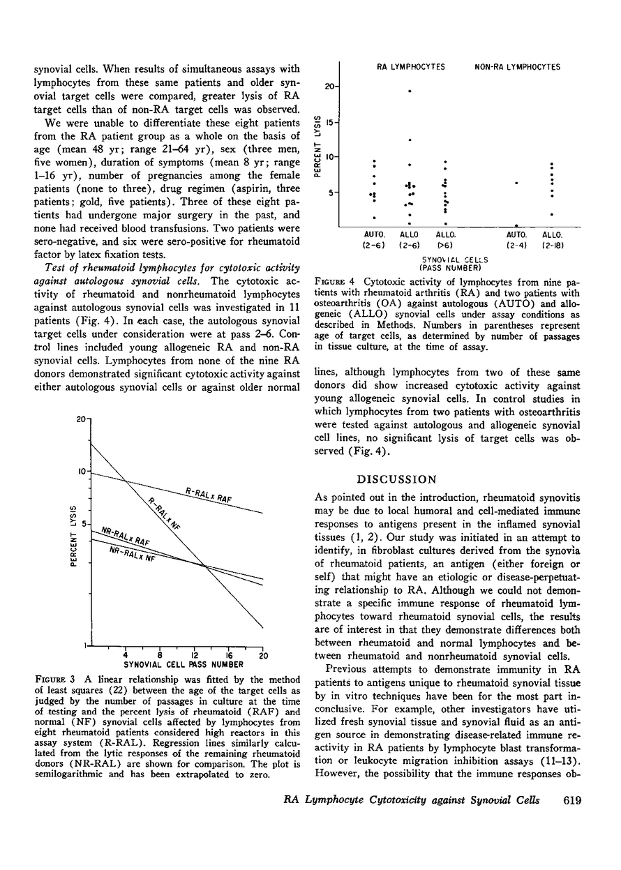 The possibility that lymphocytes from patients with rheumatoid arthritis (RA) might be sensitized to RA synovial cell antigens was investigated with a 51Cr release cytotoxicity assay. Peripheral blood lymphocytes from rheumatoid and normal donors were tested for cytotoxic activity against their own synovial cells and against allogeneic rheumatoid and nonrhemuatoid synovial cells. In the allogeneic studies, the degree of cytotoxicity was significantly influenced by the age in culture (passage number) of the synovial target cells (P less than 0.001). When the passage number of the target cells was considered in the analysis, rheumatoid lymphocytes were found to have greater cytotoxic activity than normal lymphocytes against young cultures (low passage number) of both RA and non-RA synovial cells (P = 0.0042). Differences in susceptibility to lysis between RA and non-RA synovial cells were more susceptible to both RA and normal lymphocyte-induced lysis than were non-RA synovial cells (P = 0.0048). No evidence of cytotoxicity was detected when lymphocytes from nine RA patients and two osteoarthritis patients were reacted against their own synovial cells. Although the data demonstrated an increased cytotoxic activity of peripheral blood lymphocytes from some RA patients against allogeneic synovial cells, the fact that this reactivity was seen against both non-RA and RA synovial cells and was not demonstrated against autologous synovial cells argues against the presence of an immunospecific response of RA lymphocytes to RA synovial cell antigens.