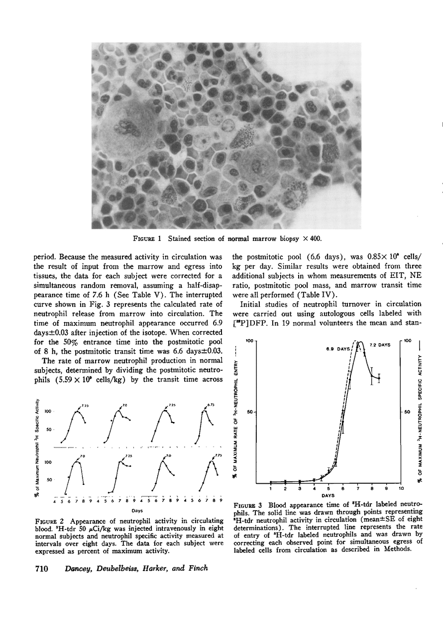 A method has been developed for measuring neutrophil cellularity in normal human bone marrow, in which the neutrophil-erythroid ratio was determined from marrow sections and marrow normoblasts were estimated by the erythron iron turnover. Neutrophil maturational categories, defined by morphologic criteria, were supported by autoradiographs of marrow flashed-labeled with 3H-thymidine. Correction for multiple counting error was empirically derived by counting serial sections through cells of each maturational category. The normal neutrophil-erythroid ratio in 13 normal human subjects was 1.5 +/- 0.07. The mean number of normoblasts in the same subjects was estimated to be 5.07 +/- 0.84 X 10(9) cells/kg. Total marrow neutrophils (X 10(9) cells/kg) were 7.70 +/- 1.20, the postmitotic pool (metamyelocytes, bands, and segmented forms) was 5.59 +/- 0.90 and the mitotic pool (promyelocytes + myelocytes) was 2.11 +/- 0.36. Marrow neutrophil ("total") production has been determined from the number of neutrophils comprising the postmitotic marrow pool divided by their transit time Transit time was derived from the appearance in circulating neutrophils of injected 3H-thymidine. The postmitotic pool comprised 5.59 +/- 0.90 X 10(9) neutrophils/kg, and the transit time was 6.60 +/- 0.03 days. From these data marrow neutrophil production was calculated to be 0.85 X 10(9) cells/kg per day. Effective production, measured as the turnover of circulating neutrophils labeled with 3H-thymidine, was 0.87 +/- 0.13 X 10(9) cells/kg per day. This value correlated well with the calculation of marrow neutrophil production. A larger turnover of 1.62 +/- 0.46 X 10(9) cells/kg per day was obtained when diisopropylfluorophosphate-32P was used to label circulating neutrophils. Studies using isologous cells doubly labeled with 3H-thymidine and diisopropylfluorophosphate-32P demonstrated a lower recovery and shorter t1/2 of the 32P label.