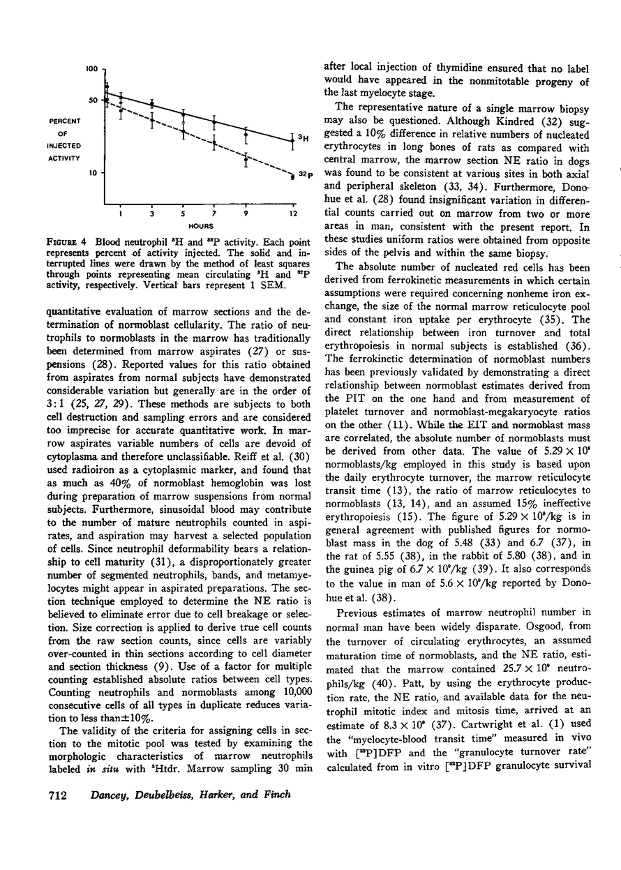 A method has been developed for measuring neutrophil cellularity in normal human bone marrow, in which the neutrophil-erythroid ratio was determined from marrow sections and marrow normoblasts were estimated by the erythron iron turnover. Neutrophil maturational categories, defined by morphologic criteria, were supported by autoradiographs of marrow flashed-labeled with 3H-thymidine. Correction for multiple counting error was empirically derived by counting serial sections through cells of each maturational category. The normal neutrophil-erythroid ratio in 13 normal human subjects was 1.5 +/- 0.07. The mean number of normoblasts in the same subjects was estimated to be 5.07 +/- 0.84 X 10(9) cells/kg. Total marrow neutrophils (X 10(9) cells/kg) were 7.70 +/- 1.20, the postmitotic pool (metamyelocytes, bands, and segmented forms) was 5.59 +/- 0.90 and the mitotic pool (promyelocytes + myelocytes) was 2.11 +/- 0.36. Marrow neutrophil ("total") production has been determined from the number of neutrophils comprising the postmitotic marrow pool divided by their transit time Transit time was derived from the appearance in circulating neutrophils of injected 3H-thymidine. The postmitotic pool comprised 5.59 +/- 0.90 X 10(9) neutrophils/kg, and the transit time was 6.60 +/- 0.03 days. From these data marrow neutrophil production was calculated to be 0.85 X 10(9) cells/kg per day. Effective production, measured as the turnover of circulating neutrophils labeled with 3H-thymidine, was 0.87 +/- 0.13 X 10(9) cells/kg per day. This value correlated well with the calculation of marrow neutrophil production. A larger turnover of 1.62 +/- 0.46 X 10(9) cells/kg per day was obtained when diisopropylfluorophosphate-32P was used to label circulating neutrophils. Studies using isologous cells doubly labeled with 3H-thymidine and diisopropylfluorophosphate-32P demonstrated a lower recovery and shorter t1/2 of the 32P label.