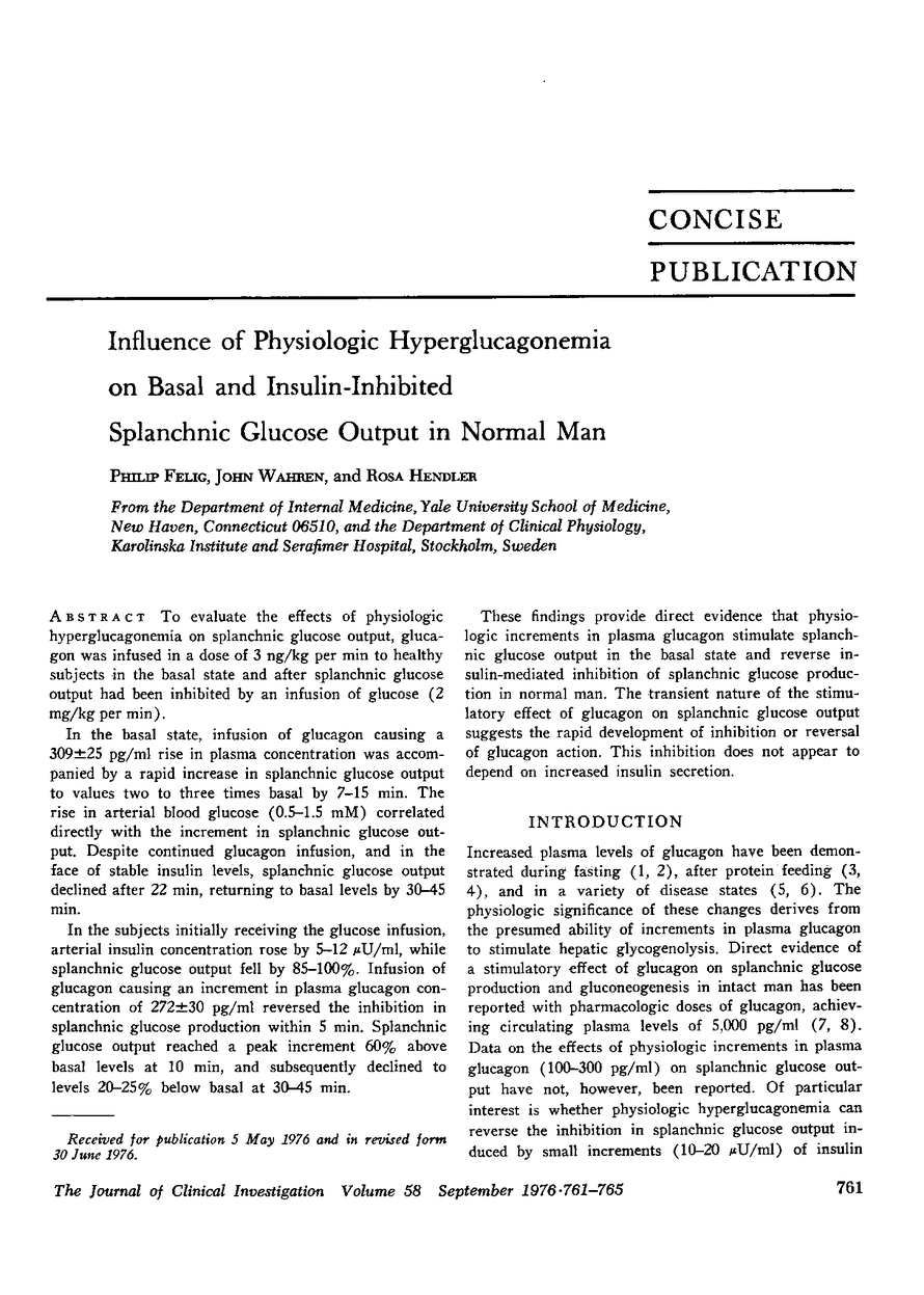 To evaluate the effects of physiologic hyperglucagonemia on splanchnic glucose output, glucagon was infused in a dose of 3 ng/kg per min to healthy subjects in the basal state and after splanchnic glucose output had been inhibited by an infusion of glucose (2 mg/kg per min). In the basal state, infusion of glucagon causing a 309 +/- 25 pg/ml rise in plasma concentration was accompanied by a rapid increase in splanchnic glucose output to values two to three times basal by 7-15 min. The rise in arterial blood glucose (0.5-1.5 mM) correlated directly with the increment in splanchnic glucose output. Despite continued glucagon infusion, and in the face of stable insulin levels, splanchnic glucose output declined after 22 min, returning to basal levels by 30-45 min. In the subjects initially receiving the glucose infusion, arterial insulin concentration rose by 5-12 muU/ml, while splanchnic glucose output fell by 85-100%. Infusion of glucagon causing an increment in plasma glucagon concentration of 272 +/- 30 pg/ml reversed the inhibition in splanchnic glucose production within 5 min. Splanchnic glucose output reached a peak increment 60% above basal levels at 10 min, and subsequently declined to levels 20-25% below basal at 30-45 min. These findings provide direct evidence that physiologic increments in plasma glucagon stimulate splanchnic glucose output in the basal state and reverse insulin-mediated inhibition of splanchnic glucose production in normal man. The transient nature of the stimulatory effect of glucagon on splanchnic glucose output suggests the rapid development of inhibition or reversal of glucagon action. This inhibition does not appear to depend on increased insulin secretio.