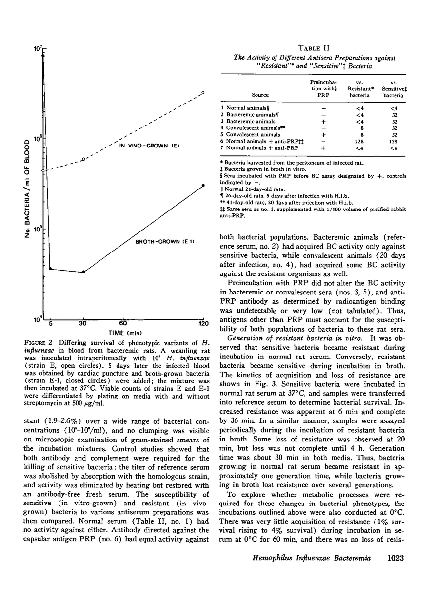 We investigated the role of serum bactericidal activity in Hemophiplus influenzae type b infections in infants with meningitis and in a rat model. In infected infants, 13/22 admission sera had bactericidal activity against the infecting strain, and bacteremia was as frequent in those with bactericidal activity (54%) as those without (56%). The coexistence of bactericidal activity and bacteremia was reproduced and studied in experimentally infected weanling rats. Serum from such rats kills in vitro 95% of conventionally broth-grown bacteria within 10 min, but does not kill organisms obtained from the infected animals. Thus bactericidal activity as conventionally determined for H. influenzae b may have no relevance in vivo, Incubation of broth-grown bacteria in normal rat serum for 30 min at 37 degrees C produces a resistance like that of in vivo organisms. This phenotypic conversion depends on factors that are of molecular weight less than 1,000, stable to 100 degrees C, but destroyed by ashing. When injected intravenously into nonimmune animals, broth-grown bacteria are quickly cleared, while serum-preincubated bacteria are not. The latter, however, are cleared when injected into bacteremic rats (half-life 30 min). Bacteremia in the rats may persist despite this capacity for clearance because bacteria are entering the blood from extravascular fluids, which contain greater than 90% of the total bacterial burden.