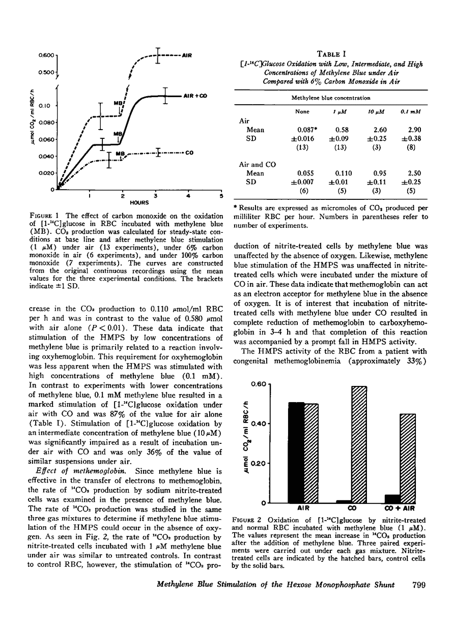 The response of the hexose monophosphate shunt in erythrocytes was studied with the ionization chamber-electrometer apparatus to measure continuously 14CO2 derived from 14C-labeled substrates. The effect of methylene blue at high (0.1 mM) and low (1 muM) concentrations was evaluated under different gas mixtures; air, carbon monoxide, and 6% carbon monoxide in air. The latter gas mixture results in nearly 100% carboxyhemoglobin but provides a physiologic partial pressure of oxygen. The extent to which pentose is recycled through the shunt in response to methylene blue stimulation was examined with radioactive glucose substrates labeled on the first, second, and third carbon positions. Generation of hydrogen peroxide after stimulation of erythrocytes with methylene blue was evaluated by the catalase-aminotriazole trapping technique, [14C]formate oxidation, and oxidation of reduced glutatione. Stimulation of the shunt with 1 muM methylene blue was markedly impaired in the absence of oxyhemoglobin, but stimulation with 0.1 mM methylene blue was only slightly impaired under the carbon monoxide-air mixture. The higher concentration of methylene blue produced evidence of hydrogen peroxide generation of all three techniques. Despite the evidence for the involvement of oxygen, oxyhemoglobin, and hydrogen peroxide in the response to methylene blue, cells containing methemoglobin induced by sodium nitrite or from a patient with congenital methemoglobinemia responded normally to methylene blue in the absence of oxygen. These experiments indicate that the reactions induced by methylene blue in erythrocytes are more complex than generally thought and that high concentrations are associated with production of peroxide.