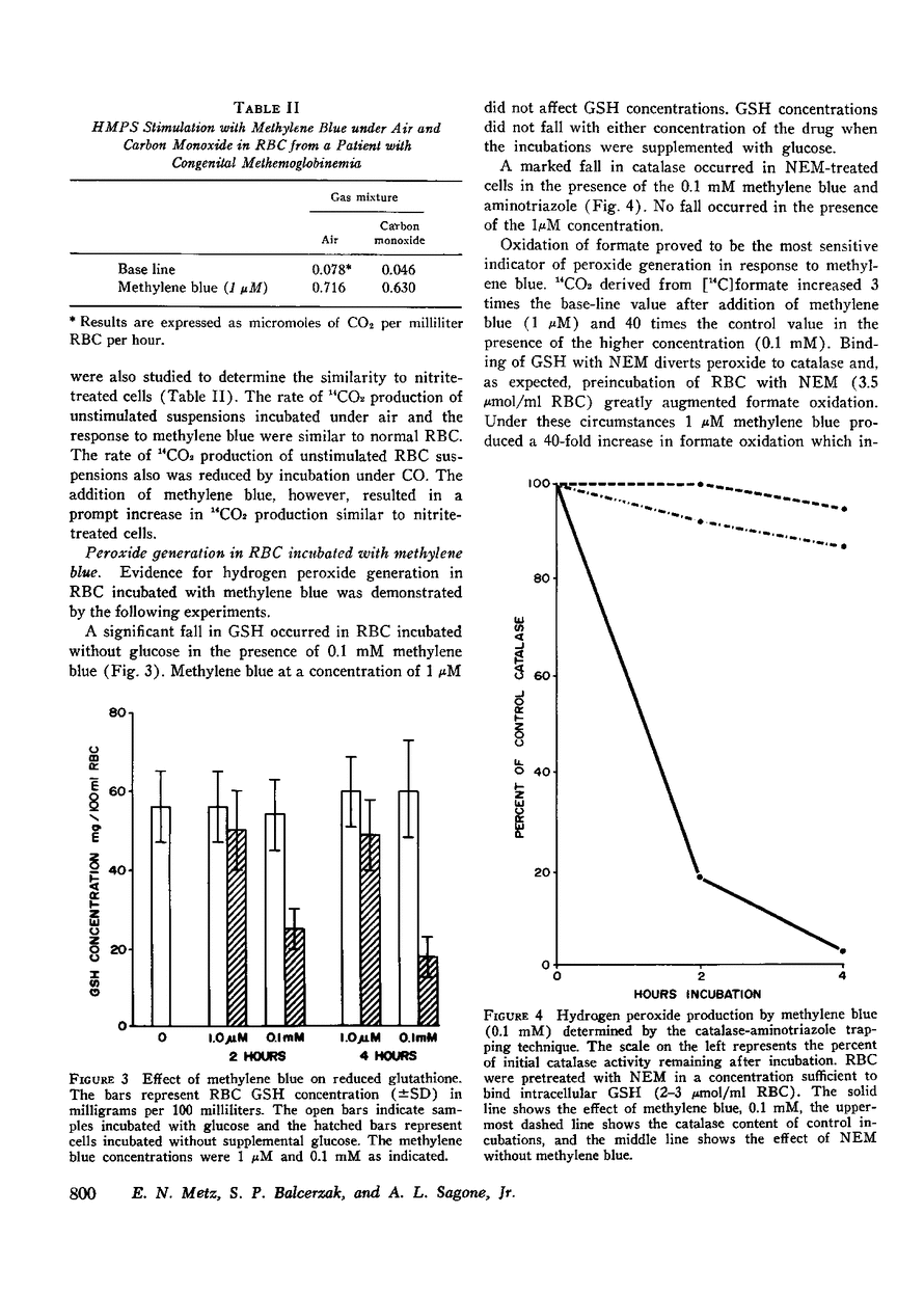 The response of the hexose monophosphate shunt in erythrocytes was studied with the ionization chamber-electrometer apparatus to measure continuously 14CO2 derived from 14C-labeled substrates. The effect of methylene blue at high (0.1 mM) and low (1 muM) concentrations was evaluated under different gas mixtures; air, carbon monoxide, and 6% carbon monoxide in air. The latter gas mixture results in nearly 100% carboxyhemoglobin but provides a physiologic partial pressure of oxygen. The extent to which pentose is recycled through the shunt in response to methylene blue stimulation was examined with radioactive glucose substrates labeled on the first, second, and third carbon positions. Generation of hydrogen peroxide after stimulation of erythrocytes with methylene blue was evaluated by the catalase-aminotriazole trapping technique, [14C]formate oxidation, and oxidation of reduced glutatione. Stimulation of the shunt with 1 muM methylene blue was markedly impaired in the absence of oxyhemoglobin, but stimulation with 0.1 mM methylene blue was only slightly impaired under the carbon monoxide-air mixture. The higher concentration of methylene blue produced evidence of hydrogen peroxide generation of all three techniques. Despite the evidence for the involvement of oxygen, oxyhemoglobin, and hydrogen peroxide in the response to methylene blue, cells containing methemoglobin induced by sodium nitrite or from a patient with congenital methemoglobinemia responded normally to methylene blue in the absence of oxygen. These experiments indicate that the reactions induced by methylene blue in erythrocytes are more complex than generally thought and that high concentrations are associated with production of peroxide.
