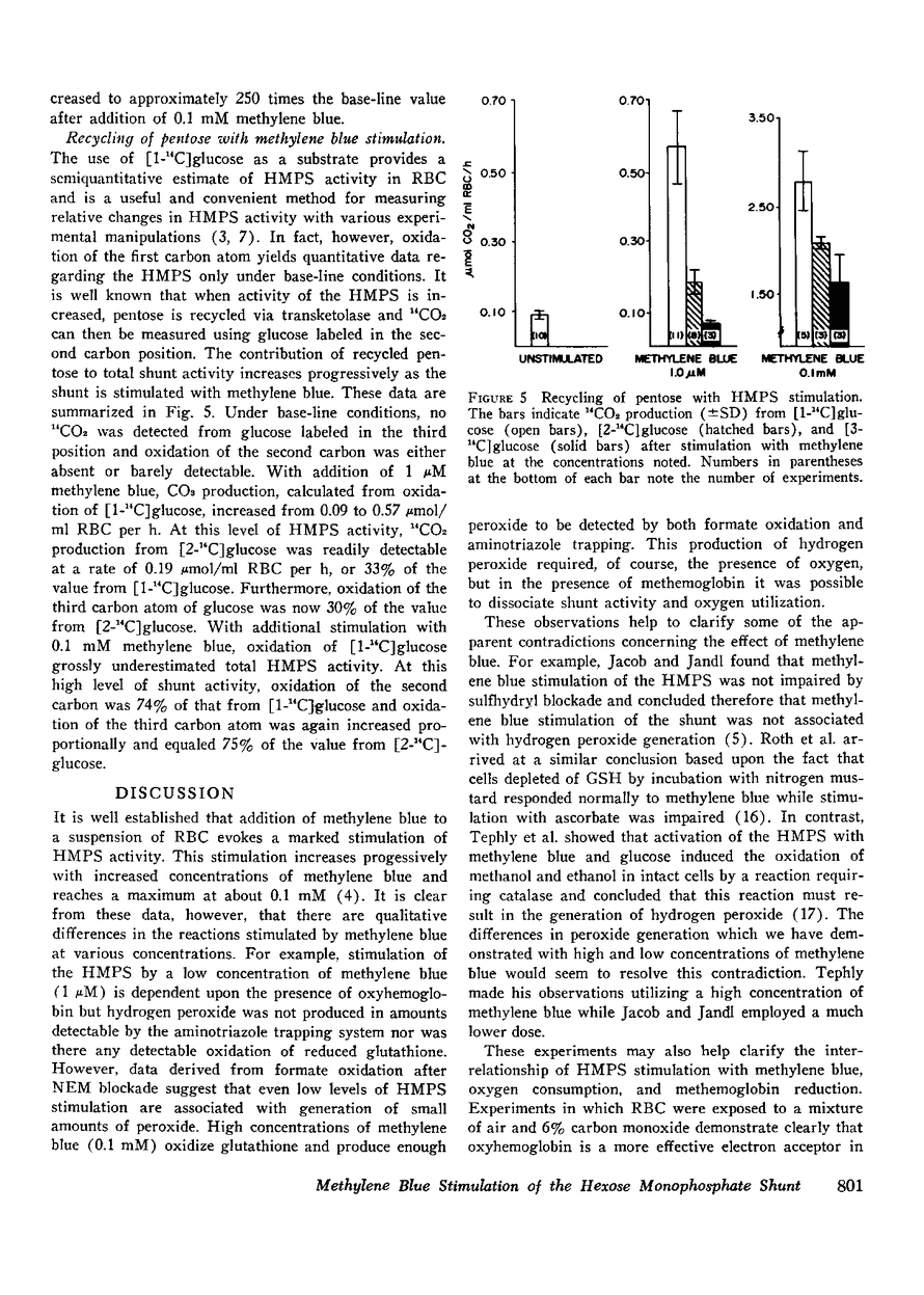 The response of the hexose monophosphate shunt in erythrocytes was studied with the ionization chamber-electrometer apparatus to measure continuously 14CO2 derived from 14C-labeled substrates. The effect of methylene blue at high (0.1 mM) and low (1 muM) concentrations was evaluated under different gas mixtures; air, carbon monoxide, and 6% carbon monoxide in air. The latter gas mixture results in nearly 100% carboxyhemoglobin but provides a physiologic partial pressure of oxygen. The extent to which pentose is recycled through the shunt in response to methylene blue stimulation was examined with radioactive glucose substrates labeled on the first, second, and third carbon positions. Generation of hydrogen peroxide after stimulation of erythrocytes with methylene blue was evaluated by the catalase-aminotriazole trapping technique, [14C]formate oxidation, and oxidation of reduced glutatione. Stimulation of the shunt with 1 muM methylene blue was markedly impaired in the absence of oxyhemoglobin, but stimulation with 0.1 mM methylene blue was only slightly impaired under the carbon monoxide-air mixture. The higher concentration of methylene blue produced evidence of hydrogen peroxide generation of all three techniques. Despite the evidence for the involvement of oxygen, oxyhemoglobin, and hydrogen peroxide in the response to methylene blue, cells containing methemoglobin induced by sodium nitrite or from a patient with congenital methemoglobinemia responded normally to methylene blue in the absence of oxygen. These experiments indicate that the reactions induced by methylene blue in erythrocytes are more complex than generally thought and that high concentrations are associated with production of peroxide.