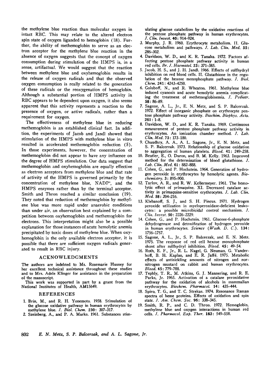 The response of the hexose monophosphate shunt in erythrocytes was studied with the ionization chamber-electrometer apparatus to measure continuously 14CO2 derived from 14C-labeled substrates. The effect of methylene blue at high (0.1 mM) and low (1 muM) concentrations was evaluated under different gas mixtures; air, carbon monoxide, and 6% carbon monoxide in air. The latter gas mixture results in nearly 100% carboxyhemoglobin but provides a physiologic partial pressure of oxygen. The extent to which pentose is recycled through the shunt in response to methylene blue stimulation was examined with radioactive glucose substrates labeled on the first, second, and third carbon positions. Generation of hydrogen peroxide after stimulation of erythrocytes with methylene blue was evaluated by the catalase-aminotriazole trapping technique, [14C]formate oxidation, and oxidation of reduced glutatione. Stimulation of the shunt with 1 muM methylene blue was markedly impaired in the absence of oxyhemoglobin, but stimulation with 0.1 mM methylene blue was only slightly impaired under the carbon monoxide-air mixture. The higher concentration of methylene blue produced evidence of hydrogen peroxide generation of all three techniques. Despite the evidence for the involvement of oxygen, oxyhemoglobin, and hydrogen peroxide in the response to methylene blue, cells containing methemoglobin induced by sodium nitrite or from a patient with congenital methemoglobinemia responded normally to methylene blue in the absence of oxygen. These experiments indicate that the reactions induced by methylene blue in erythrocytes are more complex than generally thought and that high concentrations are associated with production of peroxide.