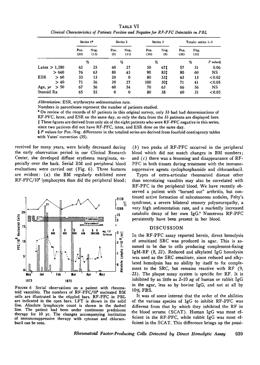 Lymphocytes secreting anti-IgC antibodies, rheumatoid factors (RF), can be detected in the peripheral bloods, synovial fluids, and bone marrows of patients with seropositive rheumatoid arthritis by using a direct plaque-forming cell (PFC) assay with sheep erythrocytes sensitized with reduced and alkylated rabbit IgG hemolysin. The autospecific nature of the RF produced by RF-PFC was indicated by inhibition studies in which the order of patency was human IgG greater than rabbit IgG greater than bovine IgG. In metabolic studies puromycin, cycloheximide, and venblastine suppressed RF-PFC. Cyclic AMP and cyclic GMP were without effect. A need was recognized for using full tissue culture media during the cell separation and plaquing procedures to optimize detection of the RF-PFC. RF-PFC may appear in the blood of patients intermittently despite their continuing presence in the bone marrow. They have been found in the peripheral blood, especially during acutely exacerbating polyarticular synovitis, generalized vasculities, or generally active, aggressive disease. RF-PFC were found in synovial effusions of new or recrduescent acute synovitis. RF-PFC were observed to disappear from the peripheral circulation and the bone marrow during therapy with cytotoxic drugs. The data are consistent with the hypothesis that the appearance of RF-PFC in the peripheral blood represents an anamnestic response to transiently appearing antigen. The nature of the antigen is not specified. The bone marrow may be a site of origin of RF-PFC.
