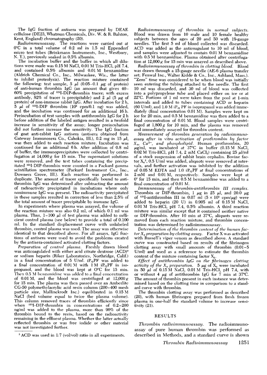 We have developed a radioimmunoassay for human thrombin using rabbit anti-human thrombin IgG. The assay can measure 2 ng thrombin/ml plasma, 500-fold more sensitive than clotting assays. Human prothrombin is less reactive in the assay than thrombin by at least four orders of magnitude, and there is no demonstrable cross-reactivity with human factor Xa, the clotting factor structurally most similar to thrombin. The assay does not detect thrombin bound to anthithrombin III. Using the assay, we have demonstrated that plasma from 20 normal subjects does not contain detectable thrombin. We measured thrombin generation in clotting blood in polypropylene tubes and observed that thrombin appears (approximately equal to 3 ng/ml) within 45 S-5 min after venipuncture. This material is thrombin, not intermediates of prothrombin activation, since it disappears after addition of heparin, which promotes thrombin antithrombin III complex formation. After a plateau of 2-10 min, there is further thrombin generation, which results in clotting after 15-27 min at a level of 40-50 ng thrombin/ml. The thrombin generated 9-25 min before clotting may activate factors V and VIII and stimulate platelet aggregation and release. In contrast, the cascade hypothesis assigns a role for thrombin only late in blood clotting. Radioimmunoassay of thrombin and other clotting factors will be useful for clinical and physiological studies of blood clotting especially since the assay seems specific for thrombin and is independent of other activities that affect bioassays.