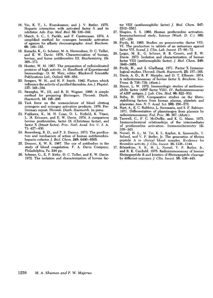 We have developed a radioimmunoassay for human thrombin using rabbit anti-human thrombin IgG. The assay can measure 2 ng thrombin/ml plasma, 500-fold more sensitive than clotting assays. Human prothrombin is less reactive in the assay than thrombin by at least four orders of magnitude, and there is no demonstrable cross-reactivity with human factor Xa, the clotting factor structurally most similar to thrombin. The assay does not detect thrombin bound to anthithrombin III. Using the assay, we have demonstrated that plasma from 20 normal subjects does not contain detectable thrombin. We measured thrombin generation in clotting blood in polypropylene tubes and observed that thrombin appears (approximately equal to 3 ng/ml) within 45 S-5 min after venipuncture. This material is thrombin, not intermediates of prothrombin activation, since it disappears after addition of heparin, which promotes thrombin antithrombin III complex formation. After a plateau of 2-10 min, there is further thrombin generation, which results in clotting after 15-27 min at a level of 40-50 ng thrombin/ml. The thrombin generated 9-25 min before clotting may activate factors V and VIII and stimulate platelet aggregation and release. In contrast, the cascade hypothesis assigns a role for thrombin only late in blood clotting. Radioimmunoassay of thrombin and other clotting factors will be useful for clinical and physiological studies of blood clotting especially since the assay seems specific for thrombin and is independent of other activities that affect bioassays.