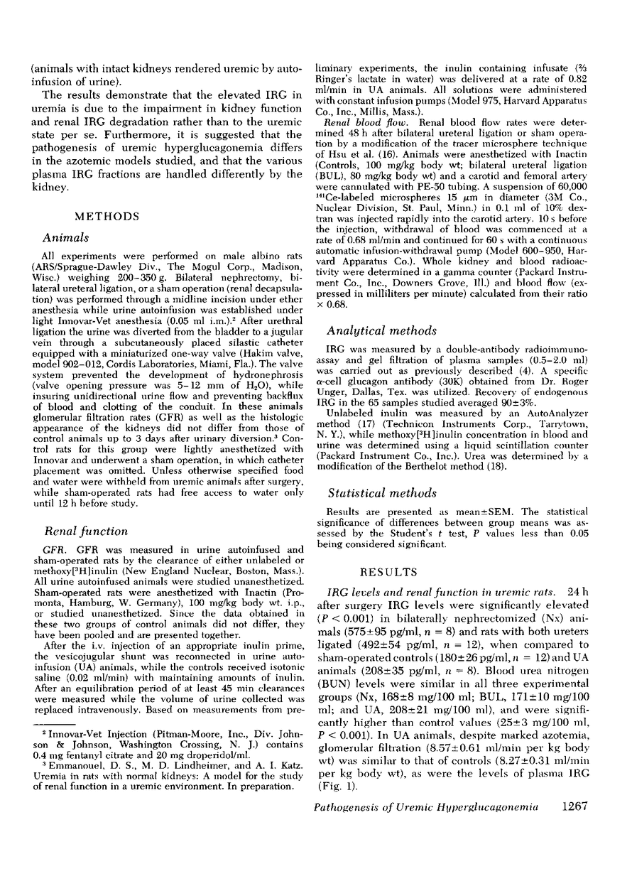 The pathogenesis of hyperglucagonemia and of the alterations in the pattern of circulating immunoreactive glucagon (IRG) associated with renal insufficiency was studied in rats in which a comparable degree of uremia was induced by three different methods, i.e., bilateral nephrectomy, bilateral ureteral ligation, and urine autoinfusion. Nephrectomized and ureteral-ligated rats were markedly hyperglucagonemic (575 +/- 95 pg/ml and 492 +/- 54 pg/ml, respectively), while IRG levels of urine autoinfused animals (208 +/- 35 pg/ml) were similar to those of control rats (180 +/- 26 pg/ml), indicating that uremia per se does not account for the hyperglucagonemia observed in renal failure. Similarly, plasma IRG composition in this group of animals was indistinguishable from that of controls, in which 88.2 +/- 5.9% of total IRG consisted of the 3,500-mol wt fraction. The same component was almost entirely responsible (82.6 +/- 4.1%) for the hyperglucagonemia observed in ligated rats, while it accounted for only 57.6 +/- 5.0% of the circulating IRG in nephrectomized animals. In the latter group, 36.8 +/- 6.6% of total IRG had a mol wt of approximately 9,000, consistent with a glucagon precursor. This peak was present in samples obtained as early as 2 h after renal ablation and its concentration continued to increase with time reaching maximal levels at 24 h. These results confirm that the kidney is a major site of glucagon metabolism and provide evidence that the renal handling of the various circulating IRG components may involve different mechanisms. Thus, the metabolism of the 3,500-mol wt fraction is dependent upon glomerular filtration, while the uptake of the 9,000-mol wt material can proceed in its absence, as long as renal tissue remains adequately perfused. This finding suggests that the 9,000-mol wt component may be handled by peritubular uptake.