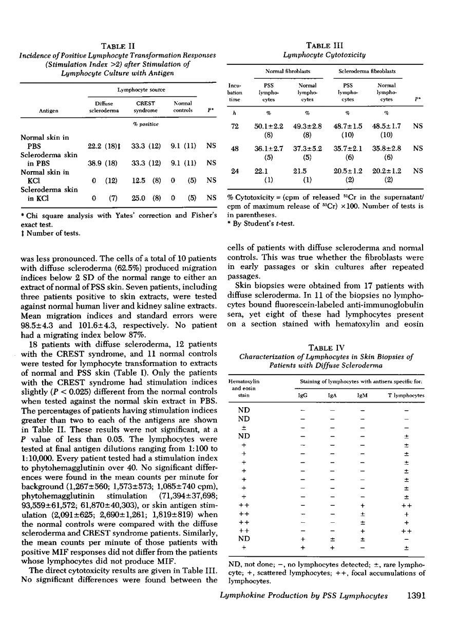 Cell-mediated immunity to skin extracts was studied by the macrophage migration inhibition test, lymphocyte transformation, and direct cytotoxicity to skin fibroblasts, in normal individuals and patients with progressive systemic sclerosis. The latter included 18 individuals with diffuse scleroderma and 12 with the CREST syndrome, a variant form of systemic sclerosis in which there is more limited involvement of the skin. Controls consisted of 13 patients with other connective tissue diseases and 16 normal individuals. Phosphate-buffered saline and 3 M KCl extracts of both normal and sclerodermatous skin were used as antigens. No evidence of lymphocyte reactivity was found by the lymphocyte transformation and direct cytotoxicity test procedures. However, the lymphocytes of patients with diffuse scleroderma did respond to extracts of both normal and sclerodermatous skin in the migration inhibition assay. 10 of 16 patients (62.5%) had migration indices below 2 SD of the normal range, 1 of 10 CREST patients and 1 of 13 patients with other connective tissue diseases showed similar reactivity. Antisera specific for immunoglobulin-bearing lymphocytes (B lymphocytes) and T lymphocytes were used to characterize the lymphocytes found in skin biopsies of patients with diffuse scleroderma. T lymphocytes made up the majority of lymphocytes in the skin infiltrates. These findings suggest that lymphocytes sensitized to skin extracts are present in patients with diffuse scleroderma. The cell-mediated immune reaction to skin antigens may be a factor in the pathogenesis of diffuse scleroderma.