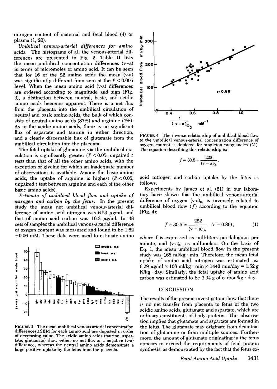 The whole blood concentrations of 22 amino acids were measured in a chronic, unstressed fetal lamb preparations. Samples were taken daily from the umbilical artery, umbilical vein, and maternal artery over the latter quarter of gestation. 73 sets of samples (from the umbilical artery and vein and the maternal artery) from 13 animals were analyzed for amino acid levels. Oxygen contents were determined simultaneously in 48 sets (umbilical artery and vein) to relate fetal oxygen consumption to amino acid uptake via the umbilical circulation. The results indicate that there is no umbilical uptake of the acidic amino acids, glutamate and aspartate; there is, in fact, a net flux of glutamate out of the fetus into the placenta. As both of these amino acids are major constituents of body proteins, the data indicate that they are formed within the fetus. The umbilical uptake of some neutral and basic amino acids (e.g., valine, leucine, isoleucine, arginine, phenylalanine, and tyrosine) is in considerable excess of estimated growth requirements, suggesting that some amino acids undergo extensive transamination and oxidative degradation in the fetus. Finally, the net uptake of nitrogen, carbon, and calories by the growing ovine fetus in the form of amino acids, glucose, and lactate is compared to estimated requirements as determined in previous studies.