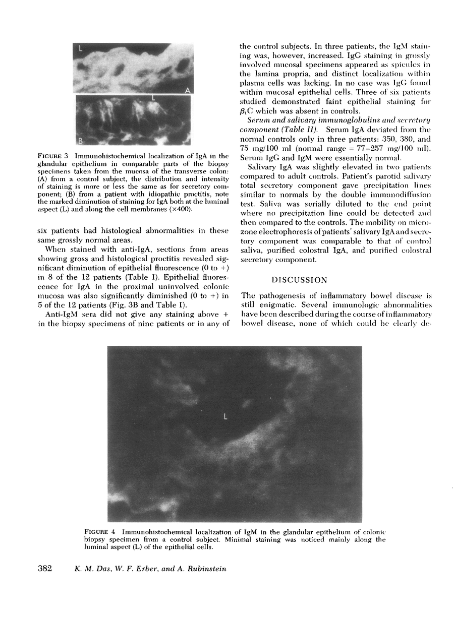 Alterations in secretory component, IgA, IgG, and IgM were studied by immunofluorescent techniques in mucosal biopsy specimens obtained at colonoscopy from inflamed and grossly uninvolved colonic mucosa from 12 patients with idiopathic proctitis. Parotid-salivary secretory component and IgA and serum immunoglobulins were also investigated. Decreased secretory IgA was observed in the epithelium of all grossly involved rectal mucosa and in 40% of proximal normal mucosa. Salivary secretory IgA was not diminished. These observations suggest that a local immune defect may be pathogenetically related to idiopathic proctitis.