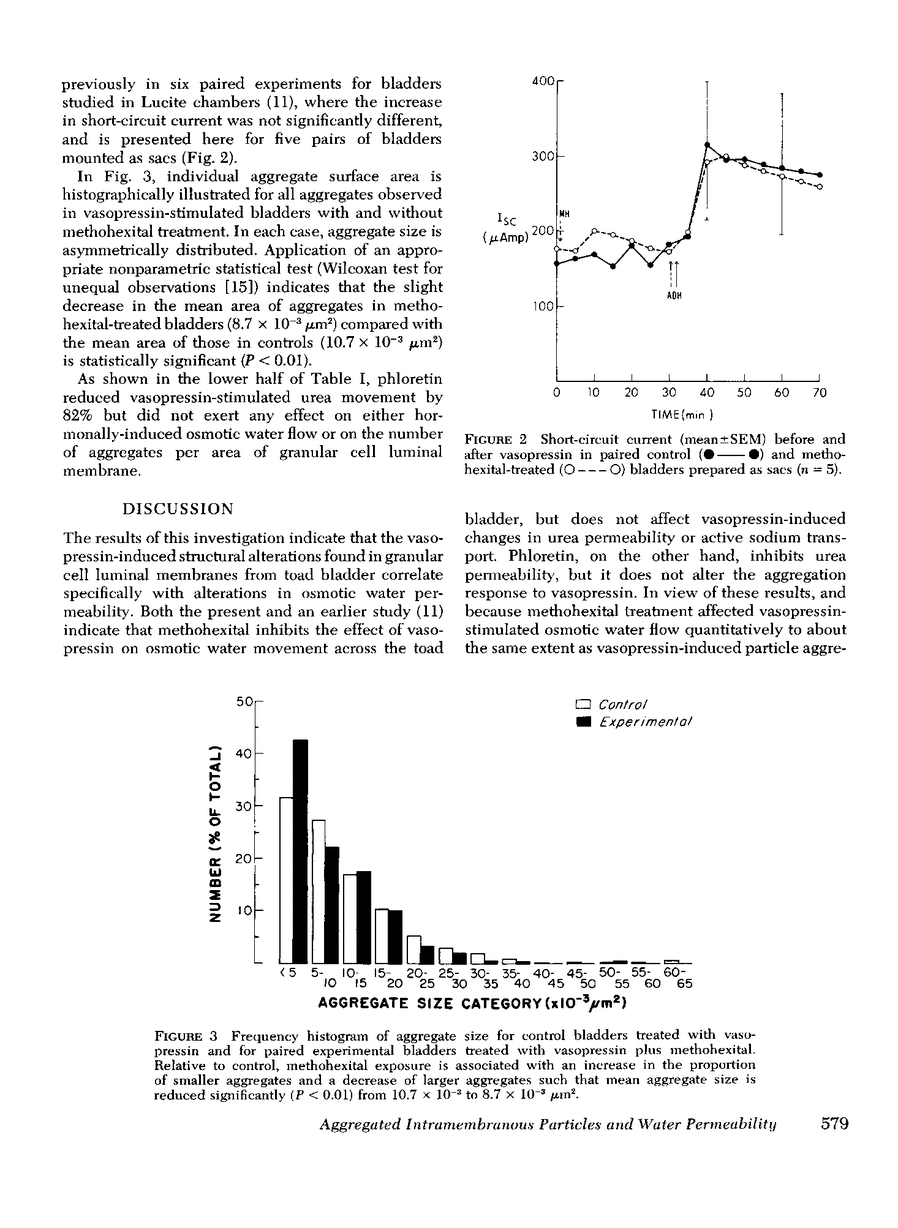 It has been previously demonstrated with freeze-fracture electron microscopy that vasopressin induces specific structural alterations of the luminal membrane of granular cells from toad urinary bladder in a dose-dependent fashion. These alterations consist of aggregated intramembranous particles and are observed both in the presence and absence of an osmotic gradient. We examined the effect of methohexital, a selective inhibitor of vasopressin-stimulated water flow, and the effect of phloretin, a selective inhibitor of urea permeability, on the structure of the granular cell luminal membrane. Methohexital treatment of the vasopressin-stimulated toad bladder reduced both the osmotic water flow and vasopressin-induced alterations of membrane structure to the same extent. Phloretin reduced urea permeability but not water flow or particle aggregation. Since neither agent affects vasopressin-stimulated sodium movement, these findings indicate that the phenomenon of particle aggregation is specifically related to vasopressin-induced water permeability and not to changes in urea or sodium permeability.