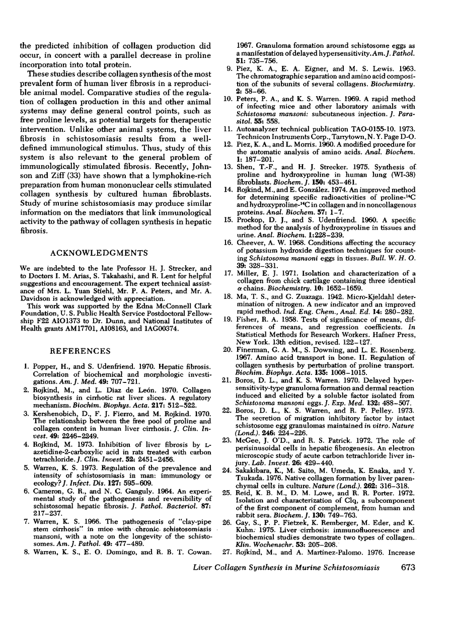 Collagen synthesis was measured in liver slices obtained from mice with hepatosplenic schistosomiasis. Enlarged fibrotic livers from these mice contained 20 times more collagen than normal. This model of hepatic fibrosis results from an inflammatory granulomatous host response to Schistosoma mansoni ova in portal tracts, rather than from direct lover cell injury as with carbon tetrachloride-induced liver fibrosis. Collagen synthesis, as measured by the formation of labeled protein-bound hydroxyproline, occurred in granulomas isolated from fibrotic livers. Labeled collagen that cochromatographed with type I collagen was extracted with neutral salt solution from liver slices incubated with labeled proline. The free proline pool of the liver was doubled in infected mice; coordinately, liver slices from these animals showed maximal collagen production when the concentration of free proline in the medium was raised to 0.4 mM, the same level measured in the fibrotic livers. Under such conditions, collagen synthesis was at a rate equivalent to the formation of 5.4 nmol of protein-bound hydroxyproline per g liver in 6 h. In comparative incubations in medium containing 0.2 mM proline, fibrotic liver slices produced 16-fold more collagen than normal slices. The proline analogue, L-azetidine 2-carboxylic acid, effectively inhibited synthesis of labeled collagen by fibrotic liver slices. These studies show the synthesis of collagen in a reproducible animal model of the most prevalent form of human liver fibrosis. Difinitition of the controlling factors in this system is of interest for the general problem of fibrosis produced by immunological responses.