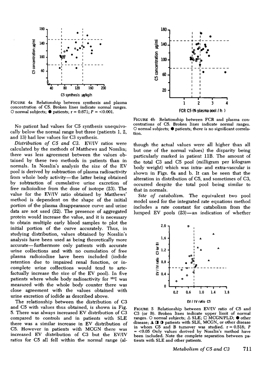 The metabolism of the fifth component of complement (C5), and its relatonship to metabolism of the third component of complement (C3), has been studied in normal subjects and patients by simultaneous administration of radioiodine labeled C5 and C3. In seven normal subjects the fractional catabolic rate of C5 ranged from 1.5 to 2.1% of the plasma pool/h and extravascular/intravascular distribution ratio from 0.22 to 0.78, these values being similar to those obtained for C3, and synthesis rate from 71 to 134 mug/kg per h, In patients with complement activation the increase in fractional catabolic rate of C5 was nearly always less than that of C3. The data also showed that there was increased extravascular distribution of C3 and C5 in most patients and considerable extravascular catabolism of both proteins in some. However, there were differences in metabolic parameters between patients with different types of complement activation. In patients with systemic lupus erythematosus, fractional catabolism and extravascular distribution of C3 and C5 were both increased, and there was marked extravascular catabolism of both proteins. There was increased fractional catabolism and extravascular distribution of C3 in patients with mesangiocapillary nephritis and (or) partial lipodystrophy, and fractional catabolism of C5 was also increased in three of six studies although distribution of C5 was always within the normal range; however, in two patients with nephritic factor in their serum fractional catabolism of C5 was normal despite markedly increased C3 turnover, suggesting that in patients with alternative pathway activation by nephritic factor little or no C5 convertase is generated.