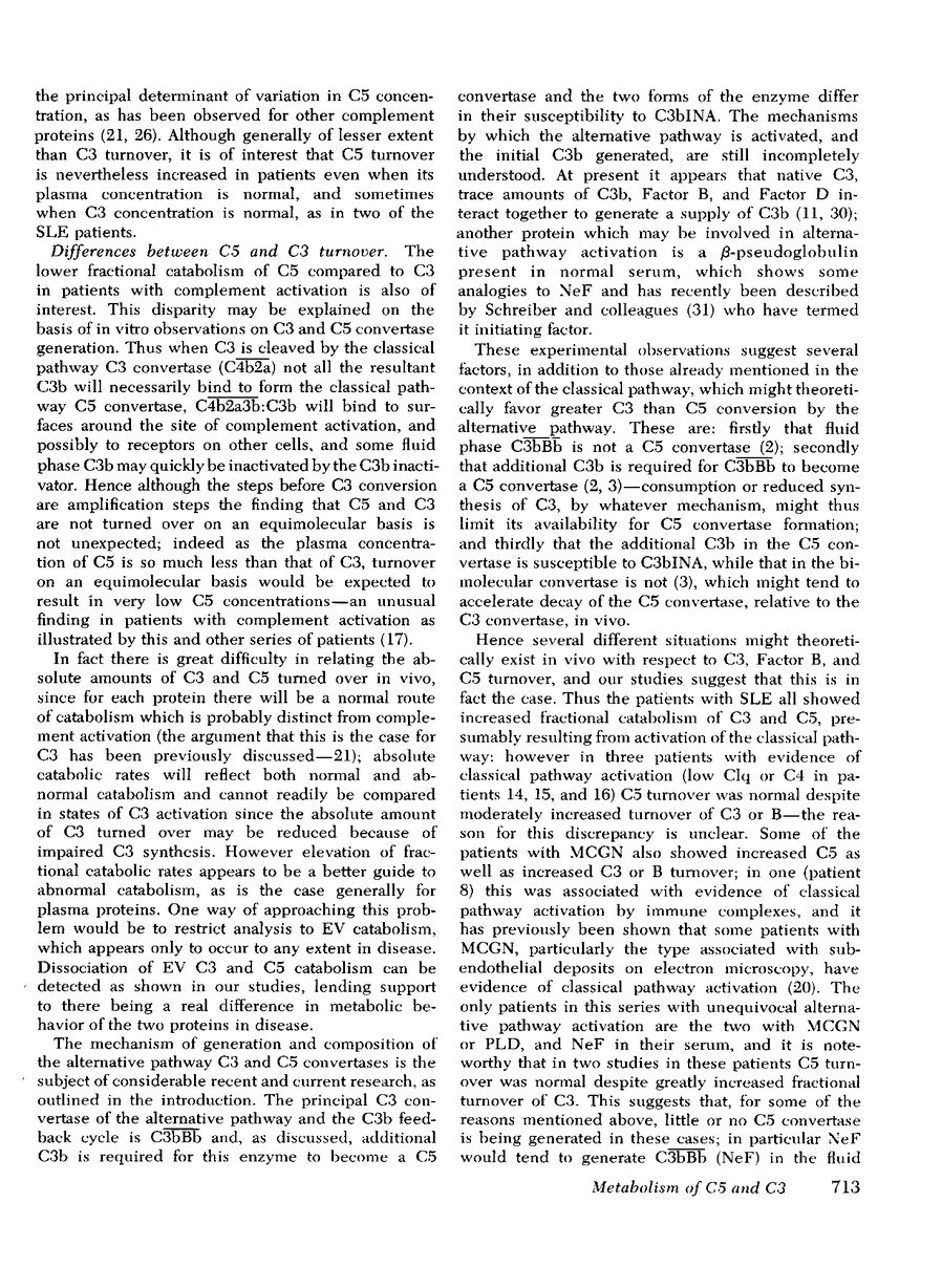 The metabolism of the fifth component of complement (C5), and its relatonship to metabolism of the third component of complement (C3), has been studied in normal subjects and patients by simultaneous administration of radioiodine labeled C5 and C3. In seven normal subjects the fractional catabolic rate of C5 ranged from 1.5 to 2.1% of the plasma pool/h and extravascular/intravascular distribution ratio from 0.22 to 0.78, these values being similar to those obtained for C3, and synthesis rate from 71 to 134 mug/kg per h, In patients with complement activation the increase in fractional catabolic rate of C5 was nearly always less than that of C3. The data also showed that there was increased extravascular distribution of C3 and C5 in most patients and considerable extravascular catabolism of both proteins in some. However, there were differences in metabolic parameters between patients with different types of complement activation. In patients with systemic lupus erythematosus, fractional catabolism and extravascular distribution of C3 and C5 were both increased, and there was marked extravascular catabolism of both proteins. There was increased fractional catabolism and extravascular distribution of C3 in patients with mesangiocapillary nephritis and (or) partial lipodystrophy, and fractional catabolism of C5 was also increased in three of six studies although distribution of C5 was always within the normal range; however, in two patients with nephritic factor in their serum fractional catabolism of C5 was normal despite markedly increased C3 turnover, suggesting that in patients with alternative pathway activation by nephritic factor little or no C5 convertase is generated.