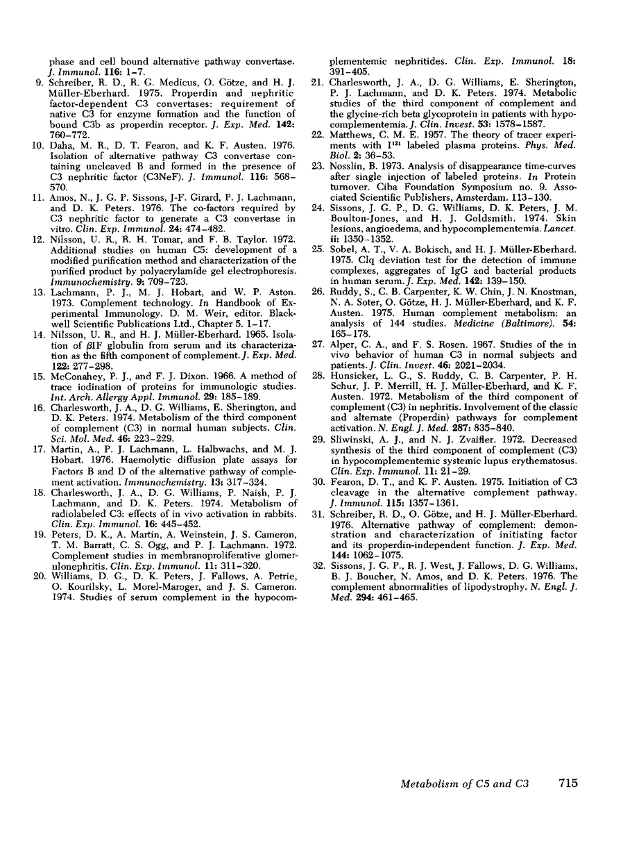 The metabolism of the fifth component of complement (C5), and its relatonship to metabolism of the third component of complement (C3), has been studied in normal subjects and patients by simultaneous administration of radioiodine labeled C5 and C3. In seven normal subjects the fractional catabolic rate of C5 ranged from 1.5 to 2.1% of the plasma pool/h and extravascular/intravascular distribution ratio from 0.22 to 0.78, these values being similar to those obtained for C3, and synthesis rate from 71 to 134 mug/kg per h, In patients with complement activation the increase in fractional catabolic rate of C5 was nearly always less than that of C3. The data also showed that there was increased extravascular distribution of C3 and C5 in most patients and considerable extravascular catabolism of both proteins in some. However, there were differences in metabolic parameters between patients with different types of complement activation. In patients with systemic lupus erythematosus, fractional catabolism and extravascular distribution of C3 and C5 were both increased, and there was marked extravascular catabolism of both proteins. There was increased fractional catabolism and extravascular distribution of C3 in patients with mesangiocapillary nephritis and (or) partial lipodystrophy, and fractional catabolism of C5 was also increased in three of six studies although distribution of C5 was always within the normal range; however, in two patients with nephritic factor in their serum fractional catabolism of C5 was normal despite markedly increased C3 turnover, suggesting that in patients with alternative pathway activation by nephritic factor little or no C5 convertase is generated.