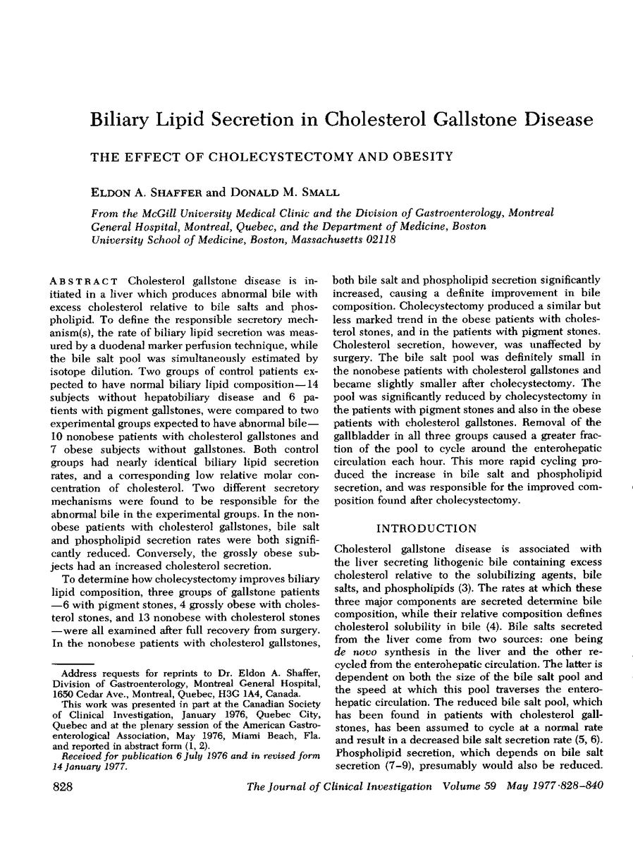 Cholesterol gallstone disease is initiated in a liver which produces abnormal bile with excess cholesterol relative to bile salts and phospholipid. To define the responsible secretory mechanism(s), the rate of biliary lipid secretion was measured by a duodenal marker perfusion technique, while the bile salt pool was simultaneously estimated by isotope dilution. Two groups of control patients expected to have normal biliary lipid composition--14 subjects without hepatobiliary disease and 6 patients with pigment gallstones, were compared to two experimental groups expected to have abnormal bile--10 nonobese patients with cholesterol gallstones and 7 obese subjects without gallstones. Both control groups had nearly identical biliary lipid secretion rates, and a corresponding low relative molar concentration of cholesterol. Two different secretory mechanisms were found to be responsible for the abnormal bile in the experimental groups. In the nonobese patients with cholesterol gallstones, bile salt and phospholipid secretion rates were both significantly reduced. Conversely, the grossly obese subjects had an increased cholesterol secretion. To determine how cholecystectomy improves biliary lipid composition, three groups of gallstone patients --6 with pigment stones, 4 grossly obese with cholesterol stones, and 13 nonobese with cholesterol stones --were all examined after full recovery from surgery. In the nonobese patients with cholesterol gallstones, both bile salt and phospholipid secretion significantly increased, causing a definite improvement in bile composition. Cholecystectomy produced a similar but less marked trend in the obese patients with cholesterol stones, and in the patients with pigment stones. Cholesterol secretion, however, was unaffected by surgery. The bile salt pool was definitely small in the nonobese patients with cholesterol gallstones and became slightly smaller after cholecystectomy. The pool was significantly reduced by cholecystectomyin the patients with cholesterol gallstones. Removal of the gallbladder in all three groups caused a greater fraction of the pool to cycle around the enterohepatic circulation each hour. This more rapid cycling produced the increase in bile salt and phospolipid secretion, and was responsible for the improved composition found after cholecystectomy.