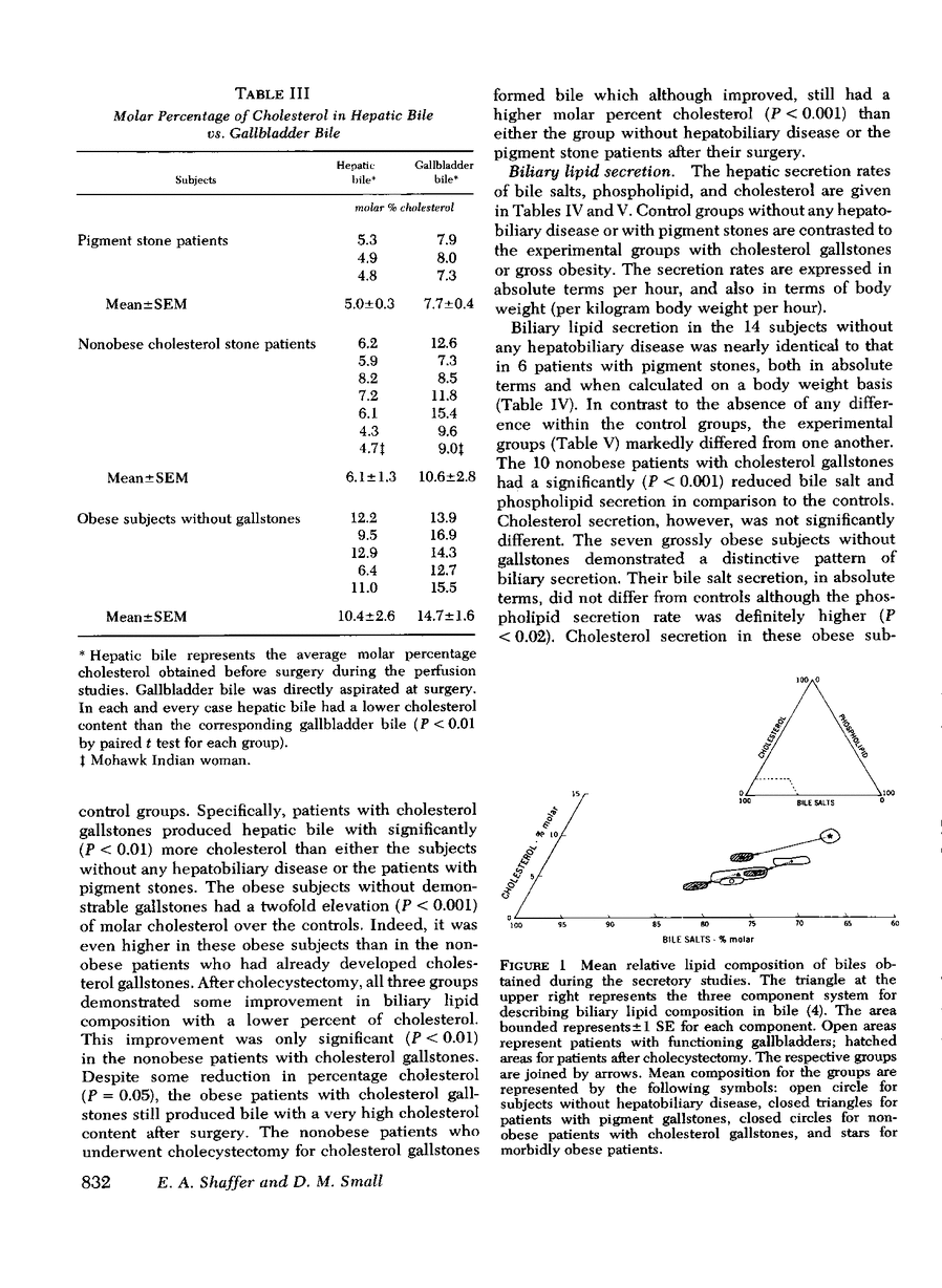 Cholesterol gallstone disease is initiated in a liver which produces abnormal bile with excess cholesterol relative to bile salts and phospholipid. To define the responsible secretory mechanism(s), the rate of biliary lipid secretion was measured by a duodenal marker perfusion technique, while the bile salt pool was simultaneously estimated by isotope dilution. Two groups of control patients expected to have normal biliary lipid composition--14 subjects without hepatobiliary disease and 6 patients with pigment gallstones, were compared to two experimental groups expected to have abnormal bile--10 nonobese patients with cholesterol gallstones and 7 obese subjects without gallstones. Both control groups had nearly identical biliary lipid secretion rates, and a corresponding low relative molar concentration of cholesterol. Two different secretory mechanisms were found to be responsible for the abnormal bile in the experimental groups. In the nonobese patients with cholesterol gallstones, bile salt and phospholipid secretion rates were both significantly reduced. Conversely, the grossly obese subjects had an increased cholesterol secretion. To determine how cholecystectomy improves biliary lipid composition, three groups of gallstone patients --6 with pigment stones, 4 grossly obese with cholesterol stones, and 13 nonobese with cholesterol stones --were all examined after full recovery from surgery. In the nonobese patients with cholesterol gallstones, both bile salt and phospholipid secretion significantly increased, causing a definite improvement in bile composition. Cholecystectomy produced a similar but less marked trend in the obese patients with cholesterol stones, and in the patients with pigment stones. Cholesterol secretion, however, was unaffected by surgery. The bile salt pool was definitely small in the nonobese patients with cholesterol gallstones and became slightly smaller after cholecystectomy. The pool was significantly reduced by cholecystectomyin the patients with cholesterol gallstones. Removal of the gallbladder in all three groups caused a greater fraction of the pool to cycle around the enterohepatic circulation each hour. This more rapid cycling produced the increase in bile salt and phospolipid secretion, and was responsible for the improved composition found after cholecystectomy.