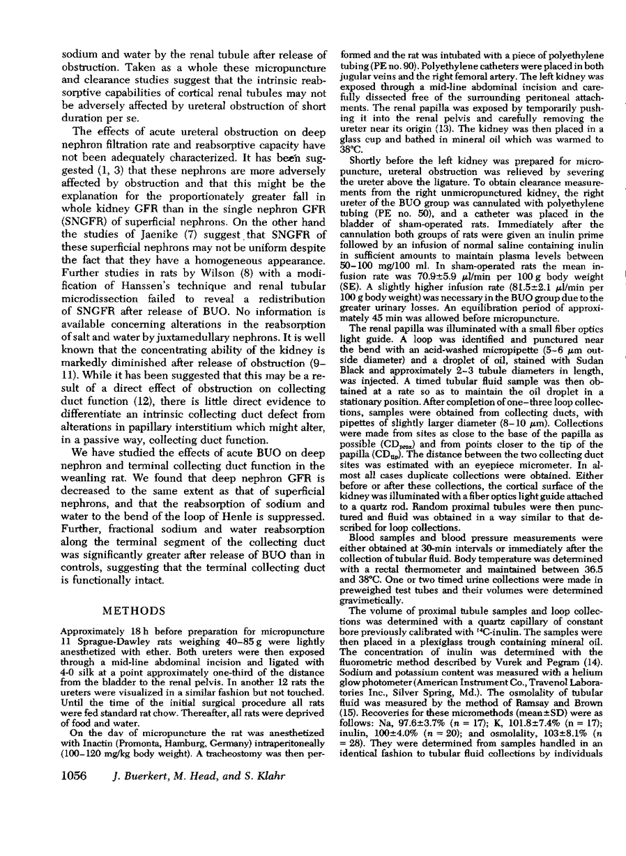 The effects of acute bilateral ureteral obstruction (BUO) of 18-h duration on deep nephron and collecting duct function were studied by micropuncture in 11 weanling rats. After release of BUO glomerular filtration rate was reduced (178±15 vs. 1,343±119 μl/min per g kidney weight in shams), while urine flow was increased averaging 17.5±1.3 vs. 6.8±0.72 μl/min per g kidney weight in controls. There was a marked increase in the absolute and fractional excretion of Na. Single nephron glomerular filtration rate of deep nephrons was reduced in the BUO group, mean 19.4±3.5 vs. 77.0±7.7 nl/min per g kidney weight in shams. Single nephron glomerular filtration rate of superficial nephrons fell to the same extent after relief of BUO. Mean tubular fluid to plasma inulin ratio of fluid from Henle's loop was 2.46±0.20 after relief of BUO vs. 8.23±0.85 in shams. This suggested a reduction in the reabsorption of Na and water before the bend of the loop of Henle, most likely in both the proximal tubule and descending limb. Fluid osmolality was depressed due to a decline in both Na and nonelectrolyte solute content. After release of BUO the percentage of filtered water remaining in the collecting duct (CD) at the base of the papilla was greater than in controls (13.3±2.0 and 1.72±0.01%, respectively) but fell significantly by the tip of the papilla to 7.92±1.12 vs. 1.17±0.02% in controls. These results indicate that water was reabsorbed along the terminal CD after relief of ureteral obstruction. In fact, a greater fraction was reabsorbed in this segment after release of BUO (5.37±1.58%) than after sham operation (0.55±0.15%). Similar changes were seen in Na excretion. Thus alterations in deep nephron function appear to contribute to the natriuresis and diuresis which follow release of BUO while terminal CD function in this model appears intact.