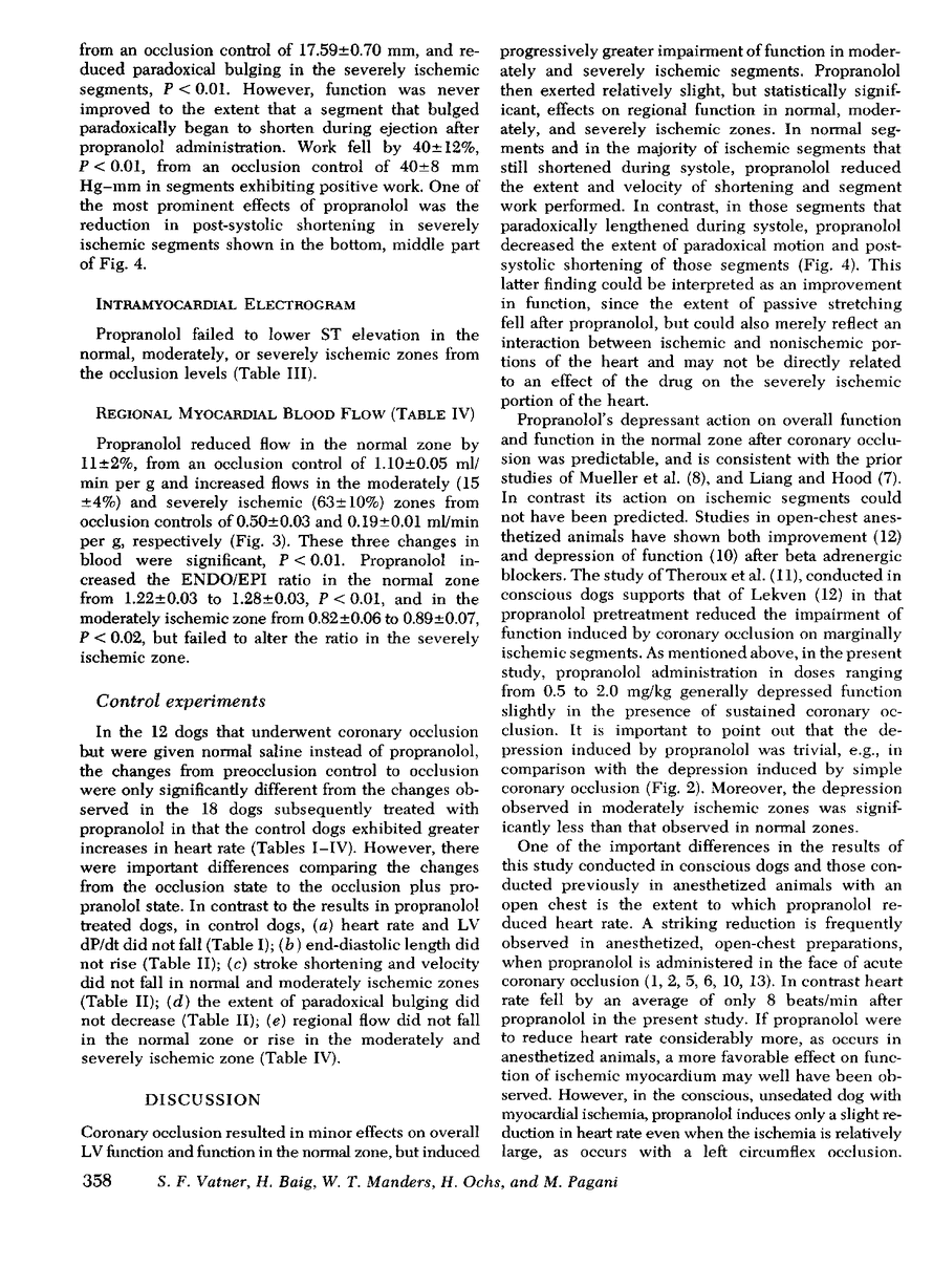 The effects of coronary occlusion and of subsequent propranolol administration were examined in 18 conscious dogs. Overall left ventricular (LV) function was assessed by measurements of LV pressure and dP/dt, and regional myocardial function was assessed by measurements of segment length (SL), velocity of SL shortening and regional myocardial “work”, i.e., pressure-length loops in normal, moderately, and severely ischemic zones. Regional intra-myocardial electrograms were measured from the same sites along with regional myocardial blood flow as determined by the radioactive microsphere technique. Coronary occlusion resulted in graded loss of function from the normal to severely ischemic zones with graded flow reduction and graded elevation of the ST segment. Propranolol depressed overall LV function, function in the normal zone (work fell by 17±4%), and in the majority of moderately ischemic segments (work fell by 7±3%). In severely ischemic segments the extent of paradoxical motion and post-systolic shortening was reduced by propranolol. After propranolol regional myocardial blood flow fell in the normal zone (11±2%) and rose in the moderately (15±4%) and severely (63±10%) ischemic zones. Thus, in the conscious dog with regional myocardial ischemia, propranolol induces a redistribution of myocardial blood flow, with flow falling in normal zones and rising in moderately and severely ischemic zones. The improvement in perfusion of ischemic tissue was associated with slight but significant depression of shortening, velocity, and work in the moderately ischemic zones and of paradoxical bulging and post-systolic shortening in the severely ischemic zone.