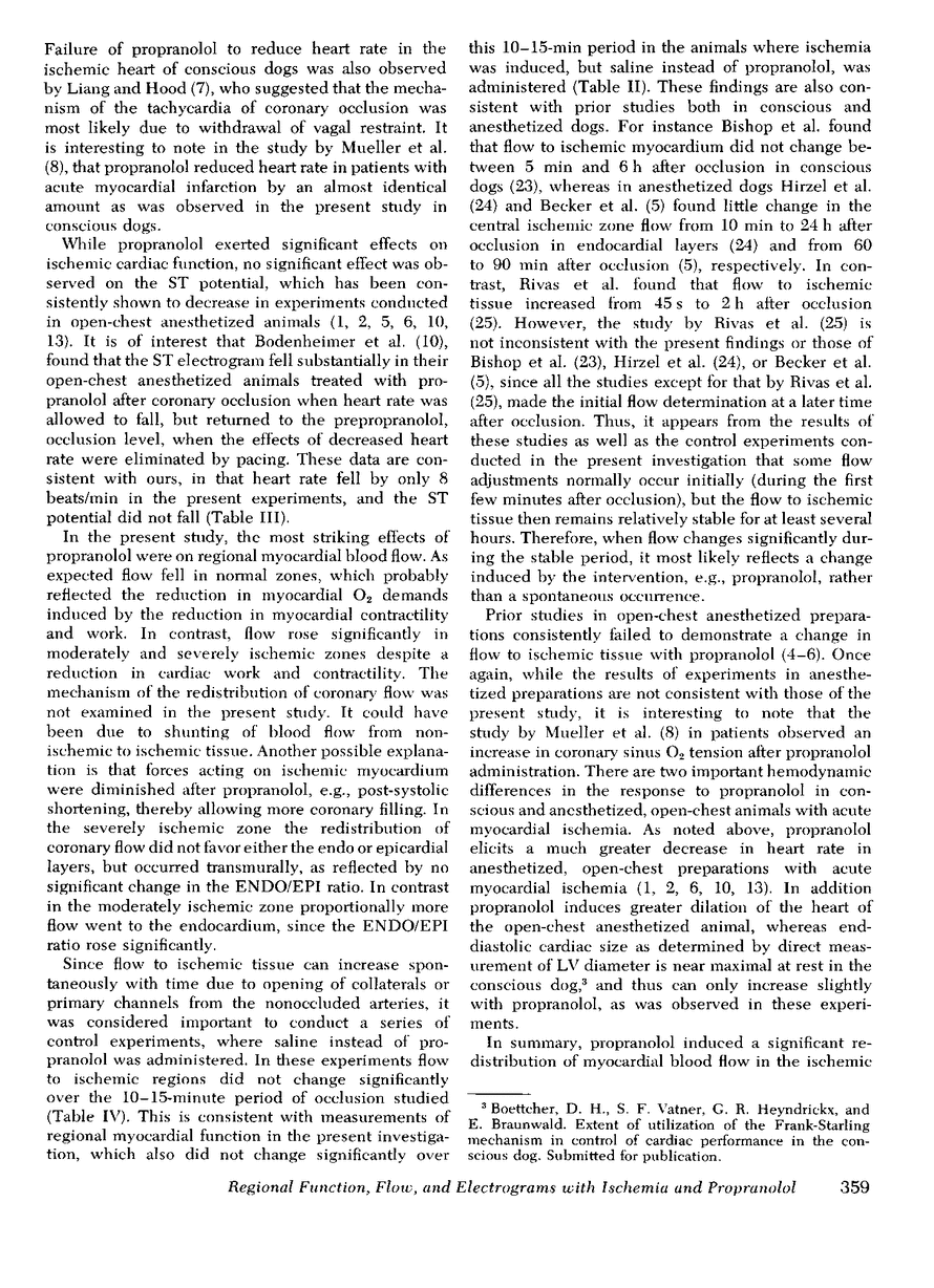 The effects of coronary occlusion and of subsequent propranolol administration were examined in 18 conscious dogs. Overall left ventricular (LV) function was assessed by measurements of LV pressure and dP/dt, and regional myocardial function was assessed by measurements of segment length (SL), velocity of SL shortening and regional myocardial “work”, i.e., pressure-length loops in normal, moderately, and severely ischemic zones. Regional intra-myocardial electrograms were measured from the same sites along with regional myocardial blood flow as determined by the radioactive microsphere technique. Coronary occlusion resulted in graded loss of function from the normal to severely ischemic zones with graded flow reduction and graded elevation of the ST segment. Propranolol depressed overall LV function, function in the normal zone (work fell by 17±4%), and in the majority of moderately ischemic segments (work fell by 7±3%). In severely ischemic segments the extent of paradoxical motion and post-systolic shortening was reduced by propranolol. After propranolol regional myocardial blood flow fell in the normal zone (11±2%) and rose in the moderately (15±4%) and severely (63±10%) ischemic zones. Thus, in the conscious dog with regional myocardial ischemia, propranolol induces a redistribution of myocardial blood flow, with flow falling in normal zones and rising in moderately and severely ischemic zones. The improvement in perfusion of ischemic tissue was associated with slight but significant depression of shortening, velocity, and work in the moderately ischemic zones and of paradoxical bulging and post-systolic shortening in the severely ischemic zone.