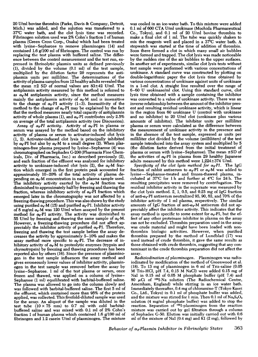 Human plasma alpha2-plasmin inhibitor in fibrinolytic states was studied using immunochemical methods and radioiodinated plasminogen. The concentration and activity of plasma alpha2-plasmin inhibitor decreased when urokinase was added to plasma in vitro or infused intravenously in man. The decrease was associated with the appearance of plasmin-alpha2-plasmin inhibitor complex which subsequently disappeared from the circulation in a short time. A decrease of other major inhibitors, such as alpha2-macroglobulin and alpha1-antitrypsin, was not observed when the amount of urokinase added or infused was relatively small, and conversion of plasminogen to plasmin was not extensive. The formation of plasmin-alpha2-macroglobulin complex was observed only when plasma plasminogen was activated with a larger amount of urokinase, and after most of the alpha2-plasmin inhibitor was consumed by forming complexes with plasmin. The formation of plasmin-alpha1-antitrypsin complex was not observed even in the highly activated plasma unless exogenous plasmin was added to the plasma. alpha2-Plasmin inhibitor was the only inhibitor of which the concentration in plasma was significantly decreased in patients with disseminated intravascular coagulation and fibrinolysis among the major plasmin inhibitors in plasma. The most reactive inhibitor for regulating plasma fibrinolysis very likely is alpha2-plasmin inhibitor.