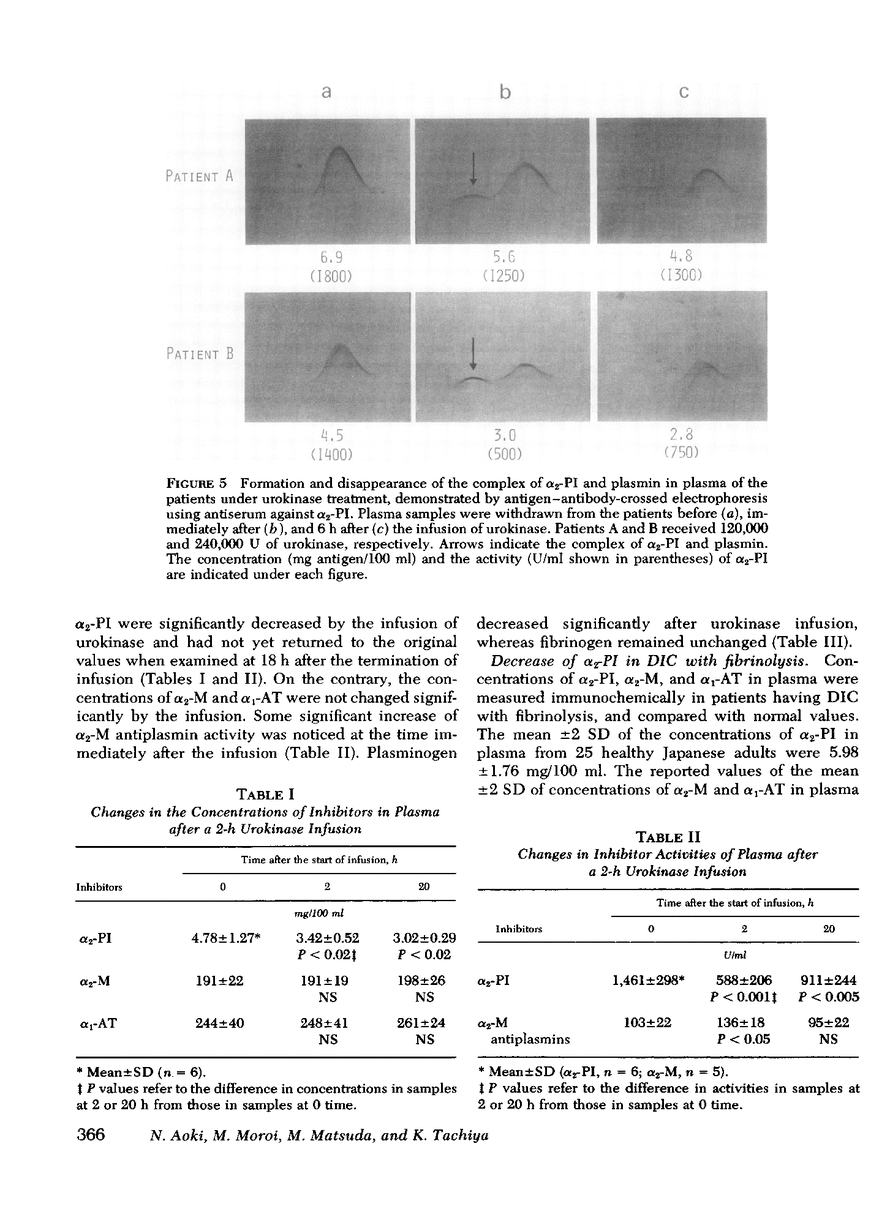 Human plasma alpha2-plasmin inhibitor in fibrinolytic states was studied using immunochemical methods and radioiodinated plasminogen. The concentration and activity of plasma alpha2-plasmin inhibitor decreased when urokinase was added to plasma in vitro or infused intravenously in man. The decrease was associated with the appearance of plasmin-alpha2-plasmin inhibitor complex which subsequently disappeared from the circulation in a short time. A decrease of other major inhibitors, such as alpha2-macroglobulin and alpha1-antitrypsin, was not observed when the amount of urokinase added or infused was relatively small, and conversion of plasminogen to plasmin was not extensive. The formation of plasmin-alpha2-macroglobulin complex was observed only when plasma plasminogen was activated with a larger amount of urokinase, and after most of the alpha2-plasmin inhibitor was consumed by forming complexes with plasmin. The formation of plasmin-alpha1-antitrypsin complex was not observed even in the highly activated plasma unless exogenous plasmin was added to the plasma. alpha2-Plasmin inhibitor was the only inhibitor of which the concentration in plasma was significantly decreased in patients with disseminated intravascular coagulation and fibrinolysis among the major plasmin inhibitors in plasma. The most reactive inhibitor for regulating plasma fibrinolysis very likely is alpha2-plasmin inhibitor.