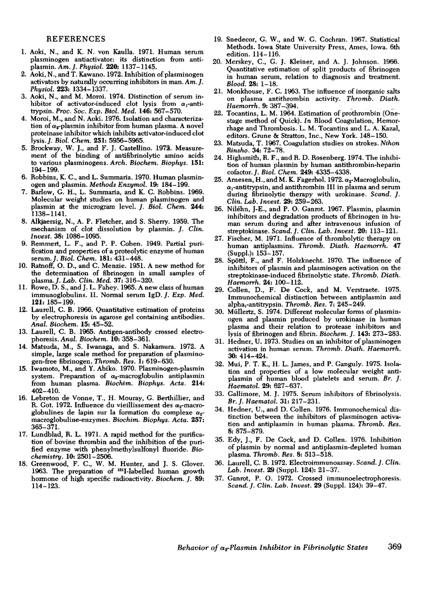 Human plasma alpha2-plasmin inhibitor in fibrinolytic states was studied using immunochemical methods and radioiodinated plasminogen. The concentration and activity of plasma alpha2-plasmin inhibitor decreased when urokinase was added to plasma in vitro or infused intravenously in man. The decrease was associated with the appearance of plasmin-alpha2-plasmin inhibitor complex which subsequently disappeared from the circulation in a short time. A decrease of other major inhibitors, such as alpha2-macroglobulin and alpha1-antitrypsin, was not observed when the amount of urokinase added or infused was relatively small, and conversion of plasminogen to plasmin was not extensive. The formation of plasmin-alpha2-macroglobulin complex was observed only when plasma plasminogen was activated with a larger amount of urokinase, and after most of the alpha2-plasmin inhibitor was consumed by forming complexes with plasmin. The formation of plasmin-alpha1-antitrypsin complex was not observed even in the highly activated plasma unless exogenous plasmin was added to the plasma. alpha2-Plasmin inhibitor was the only inhibitor of which the concentration in plasma was significantly decreased in patients with disseminated intravascular coagulation and fibrinolysis among the major plasmin inhibitors in plasma. The most reactive inhibitor for regulating plasma fibrinolysis very likely is alpha2-plasmin inhibitor.