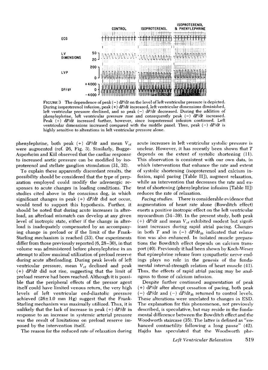 We studied the effects of acute pharmacologic and hemodynamic interventions on isovolumic left ventricular relaxation in 19 conscious dogs using micromanometer tip catheters. Isoproterenol (11 studies) augmented peak rate of rise of left ventricular pressure [(+) dP/dt] by 1,275±227 (SE) mm Hg/s (P < 0.001) and dP/dt at an isopressure point of 35 mm Hg during isovolumic relaxation [(−) dP/dt35] by 435±80 mm Hg/s (P < 0.001). Peak (−) dP/dt decreased by 467±89 mm Hg/s (P < 0.002). The time constant, T, derived from the logarithmic fall of pressure during isovolumic relaxation, shortened from 20±2.8 to 14.9±1.8 ms (P < 0.003). Calcium (11 studies) increased peak (+) dP/dt and (−) dP/dt35 (both P < 0.0001); peak (−) dP/dt was unchanged. T shortened from 20.4±1.8 to 17.3±1.5 ms (P < 0.002). Volume (13 studies) did not affect either dP/dt or T. Phenylephrine (13 studies) augmented peak (−) dP/dt, but reduced (−) dP/dt35 (both P < 0.01); T lengthened from 22.1±1.5 to 32.5±1.5 ms (P < 0.01). In 15 studies, rapid atrial pacing increased peak (+) dP/dt and (−) dP/dt35 (both P < 0.01). In the first post-pacing beat, peak (−) dP/dt and (−) dP/dt35 decreased (both P < 0.01), although peak (+) dP/dt increased further. T paralleled values of (−) dP/dt35. In five dogs, beta adrenergic blockade had no significant effect on any variable after calcium, volume, or phenylephrine infusion or during or after atrial pacing when the pre-and post-propranolol states were compared.