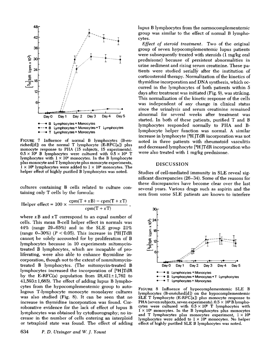 The phytohemagglutinin (PHA) response of lymphocytes from untreated patients with systemic lupus erythematosus (SLE) was studied using highly purified subpopulations of cells involved in the transformation response: T lymphocytes, B lymphocytes, and monocytes. Cell transformation was quantitated using both tritiated thymidine ([3H]-TdR) incorporation into DNA and cytofluorographic determination of cellular DNA content. Dose-response curves using six concentrations of PHA and five concentrations of cells over 0-5 days revealed a decrease in [3H]TdR by stimulated lymphocytes from some SLE patients. This decrease in [3H]TdR was paralleled by a decreased percentage of cells in S, G2, and M phases of the cell cycle. However, abnormal response occurred entirely in those SLE patients who were hypocomplementemic. The etiology of the impaired response was further examined. Lymphocyte receptors for concanavalin A were studied using cytofluorography of lymphocytes stained with fluorescein-conjugated concanavalin A. The frequency distribution of concanavalin A receptors was similar in the normocomplementemic and hypocomplementemic lupus patients and in normals. The latex phagocytic activity of lupus macrophages was similar to normals when allogeneic normal plasma was used in the culture medium. Phagocytic activity became abnormal in the presence of SLE plasma. However, there was no difference in the [3H]TdR response or the percentage of cells in S, G2, and M phases when T lymphocytes from the hypocomplementemic patients were stimulated on either autologous or normal allogeneic monocyte monolayers. Likewise, normal lymphocytes incorporated similar amounts of [3H]TdR and had similar percentages of cells in S, G2, and M phases whether their T lymphocytes were stimulated on autologous or SLE monocyte monolayers. Highly purified subpopulations of B and T lymphocytes were obtained by density sedimentation or Fenwal Leuko-Pak passage of lymphocyte populations. The response to PHA by lymphocytes from the hypocomplementemic lupus patients could be seen to involve at least two abnormalities. One, in reference to normal lymphocytes, SLE T lymphocytes plus monocytes had an impaired response; two, SLE B lymphocytes plus SLE T lymphocytes plus SLE monocytes had an impaired response. Two patients in the hypocomplementemic group were treated with steroids. 5 days after steroid treatment was initiated, the percentage of cells in S, G2, and M phases and the [3H]TdR response of PHA-stimulated lymphocytes returned to normal. The normalization of the [3H]TdR response was explained both by a return of purified T cells plus monocytes, purified B cells plus monocytes, and whole lymphocyte populations to normal responsiveness. These studies suggest that a steroid-correctable defect exists in T and B lymphocytes in SLE.