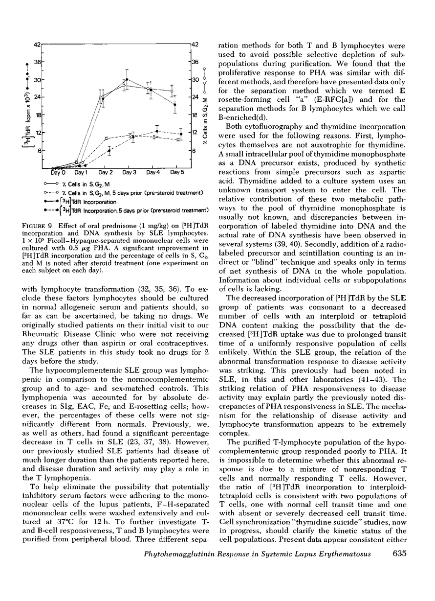 The phytohemagglutinin (PHA) response of lymphocytes from untreated patients with systemic lupus erythematosus (SLE) was studied using highly purified subpopulations of cells involved in the transformation response: T lymphocytes, B lymphocytes, and monocytes. Cell transformation was quantitated using both tritiated thymidine ([3H]-TdR) incorporation into DNA and cytofluorographic determination of cellular DNA content. Dose-response curves using six concentrations of PHA and five concentrations of cells over 0-5 days revealed a decrease in [3H]TdR by stimulated lymphocytes from some SLE patients. This decrease in [3H]TdR was paralleled by a decreased percentage of cells in S, G2, and M phases of the cell cycle. However, abnormal response occurred entirely in those SLE patients who were hypocomplementemic. The etiology of the impaired response was further examined. Lymphocyte receptors for concanavalin A were studied using cytofluorography of lymphocytes stained with fluorescein-conjugated concanavalin A. The frequency distribution of concanavalin A receptors was similar in the normocomplementemic and hypocomplementemic lupus patients and in normals. The latex phagocytic activity of lupus macrophages was similar to normals when allogeneic normal plasma was used in the culture medium. Phagocytic activity became abnormal in the presence of SLE plasma. However, there was no difference in the [3H]TdR response or the percentage of cells in S, G2, and M phases when T lymphocytes from the hypocomplementemic patients were stimulated on either autologous or normal allogeneic monocyte monolayers. Likewise, normal lymphocytes incorporated similar amounts of [3H]TdR and had similar percentages of cells in S, G2, and M phases whether their T lymphocytes were stimulated on autologous or SLE monocyte monolayers. Highly purified subpopulations of B and T lymphocytes were obtained by density sedimentation or Fenwal Leuko-Pak passage of lymphocyte populations. The response to PHA by lymphocytes from the hypocomplementemic lupus patients could be seen to involve at least two abnormalities. One, in reference to normal lymphocytes, SLE T lymphocytes plus monocytes had an impaired response; two, SLE B lymphocytes plus SLE T lymphocytes plus SLE monocytes had an impaired response. Two patients in the hypocomplementemic group were treated with steroids. 5 days after steroid treatment was initiated, the percentage of cells in S, G2, and M phases and the [3H]TdR response of PHA-stimulated lymphocytes returned to normal. The normalization of the [3H]TdR response was explained both by a return of purified T cells plus monocytes, purified B cells plus monocytes, and whole lymphocyte populations to normal responsiveness. These studies suggest that a steroid-correctable defect exists in T and B lymphocytes in SLE.