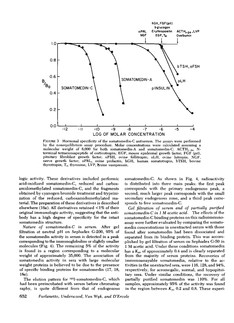 The development of a radioimmunoassay for somatomedin-C has for the first time made it possible to discriminate between serum concentrations of a single peptide or closely related group of peptides and the net somatomedin activity measured by less specific bioassay and radioreceptor techniques. Antibodies to human somatomedin-C were raised in rabbits using a somatomedin-C ovalbumin complex as the antigen. A variety of peptide hormones at concentrations up to 1 μM are not recognized by the antibody. Insulin at concentrations >0.1 μM cross reacts in a non-parallel fashion; purified somatomedin-A is only 3% as active as somatomedin-C; and radiolabeled cloned rat liver multiplication stimulating activity does not bind to the antibody. Immunoreactive somatomedin-C can also be quantitated in the sera of a variety of subhuman species.